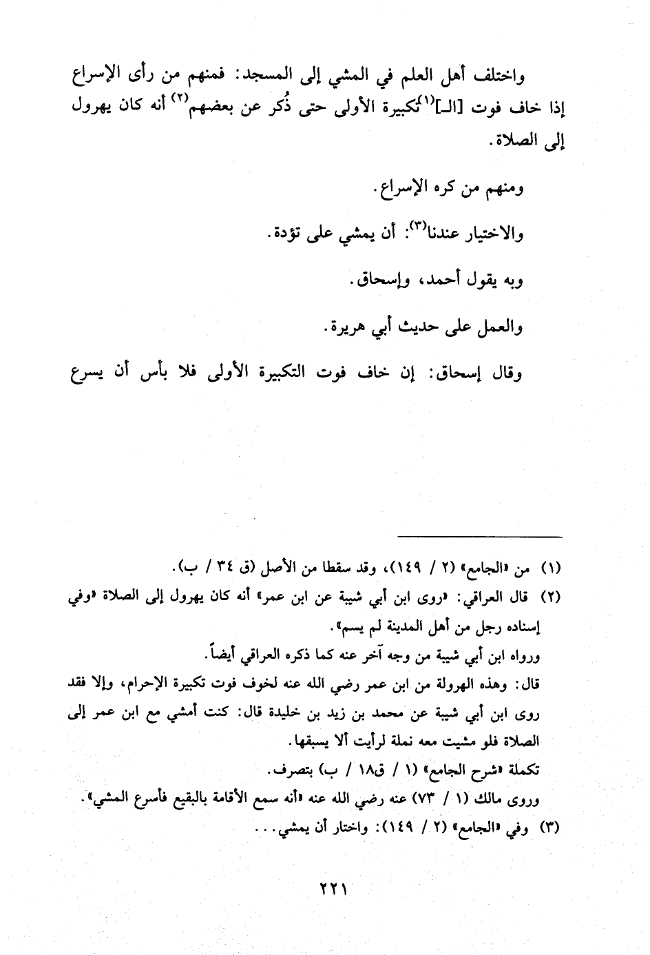وَاخْتَلَفَ أَهْلُ الْعِلْمِ فِي الْمَشْيِ إِلَى الْمَسْجِدِ فَمِنْهُمْ مَنْ رَأَى الإِسْرَاعَ إِذَا خَافَ فَوْتَ التَّكْبِيرَةِ الأُولَى حَتَّى ذُكِرَ عَنْ بَعْضِهِمْ أَنَّهُ كَانَ يُهَرْوِلُ إِلَى الصَّلاةِ