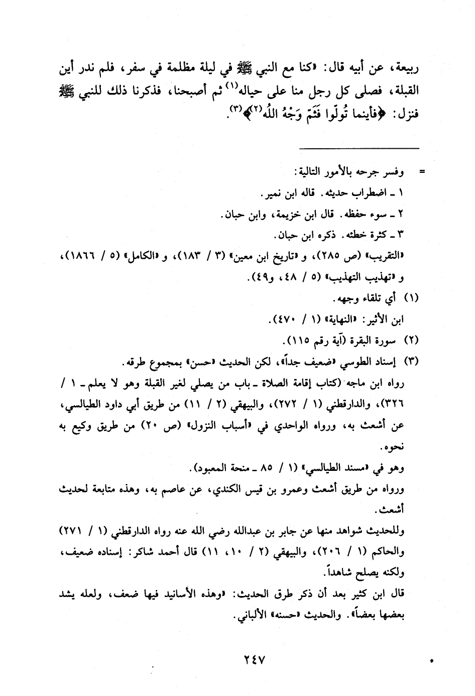 رَبِيعَةَ عَنْ أَبِيهِ قَالَ كُنَّا مَعَ النَّبِيِّ صَلَّى اللَّهُ عَلَيْهِ وَسَلَّمَ فِي لَيْلَةٍ مُظْلِمَةٍ فِي سَفَرٍ فَلَمْ نَدْرِ أَيْنَ الْقِبْلَةُ فَصَلَّى كُلُّ رَجُلٍ مِنَّا عَلَى حِيَالِهِ ثُمَّ أَصْبَحْنَا فَذَكَرْنَا ذَلِكَ لِلنَّبِيِّ صَلَّى اللَّهُ عَلَيْهِ وَسَلَّمَ فَنزل {فأينما توَلّوا فثم وَجه الله}