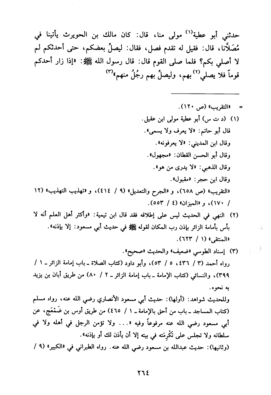 حَدَّثَنِي أَبُو عَطِيَّةَ مَوْلًى مِنَّا قَالَ كَانَ مَالِكُ بْنُ الْحُوَيْرِثِ يَأْتِينَا فِي مُصَلانَا قَالَ فَقِيلَ لَهُ تَقَدَّمْ فَصَلِّ فَقَالَ لِيُصَلِّ بَعْضُكُمْ حَتَّى أُحَدِّثَكُمْ لِمَ لَا أُصَلِّي بِكُمْ فَلَمَّا صَلَّى الْقَوْمُ قَالَ قَالَ رَسُولُ اللَّهِ صَلَّى اللَّهُ عَلَيْهِ وَسَلَّمَ إِذَا زَارَ أَحَدُكُمْ قَوْمًا فَلا يُصَلِّي بِهِمْ وَلْيُصَلِّ بِهِمْ رَجُلٌ مِنْهُمْ