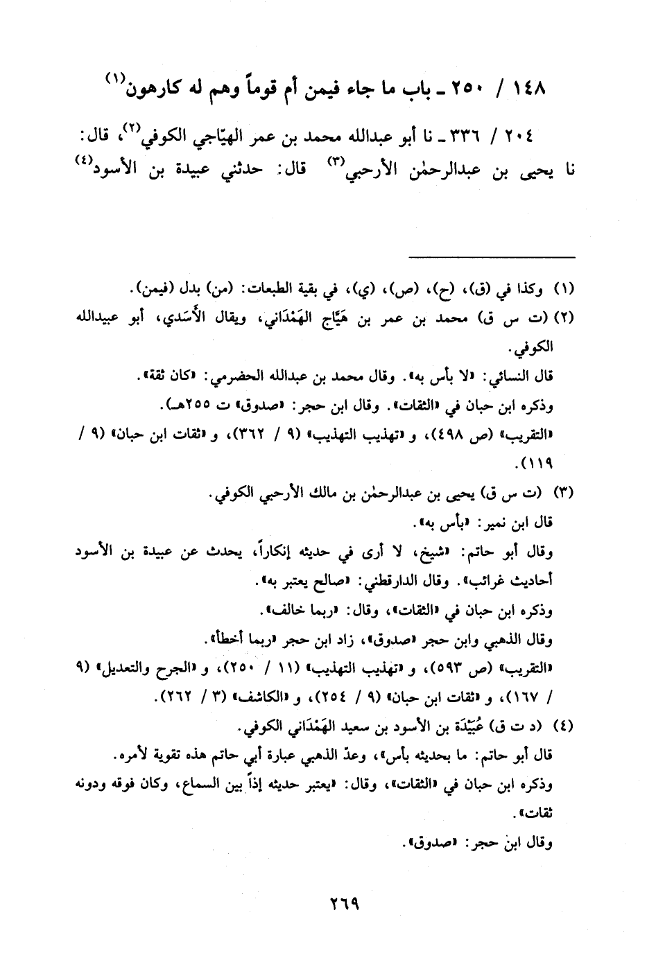 204 - / 336 نَا أَبُو عَبْدِ اللَّهِ مُحَمَّدُ بْنُ عُمَرَ الْهَيَّاجِيُّ الْكُوفِيُّ قَالَ نَا يَحْيَى بْنُ عَبْدِ الرَّحْمَنِ الأَرْحَبِيُّ قَالَ حَدَّثَنِي عُبَيْدَةُ بن الْأسود