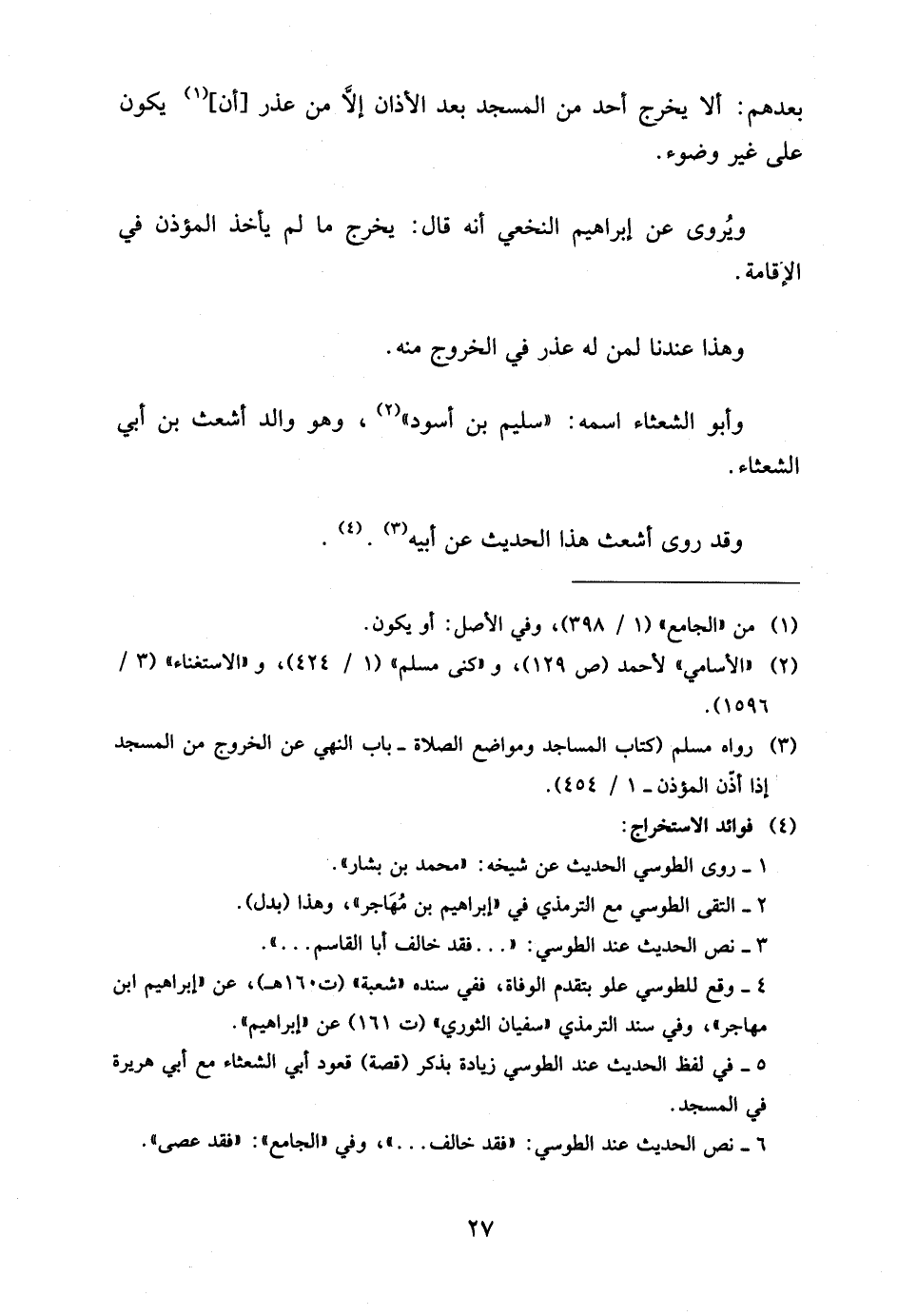 بَعْدَهُمْ أَلا يَخْرُجَ أَحَدٌ مِنَ الْمَسْجِدِ بَعْدَ الأَذَانِ إِلا مِنْ عُذْرٍ أَنْ يَكُونَ عَلَى غَيْرِ وُضُوءٍ