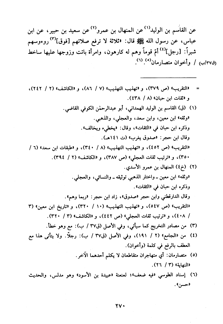 عَنِ الْقَاسِمِ بْنِ الْوَلِيدِ عَنِ الْمِنْهَالِ بْنِ عَمْرو عَن سعيد بن حبير عَنِ ابْنِ عَبَّاسٍ عَنْ رَسُولِ اللَّهِ صَلَّى اللَّهُ عَلَيْهِ وَسَلَّمَ قَالَ ثَلاثَةٌ لَا تُرْفَعُ صلَاتهم فَوق روءوسهم شِبْرًا رَجُلٌ أَمَّ قَوْمًا وَهُمْ لَهُ كَارِهُونَ وَامْرَأَةٌ بَاتَتْ وَزَوْجُهَا عَلَيْهَا سَاخِطٌ وَأَخَوَانِ مُتَصَارِمَانِ