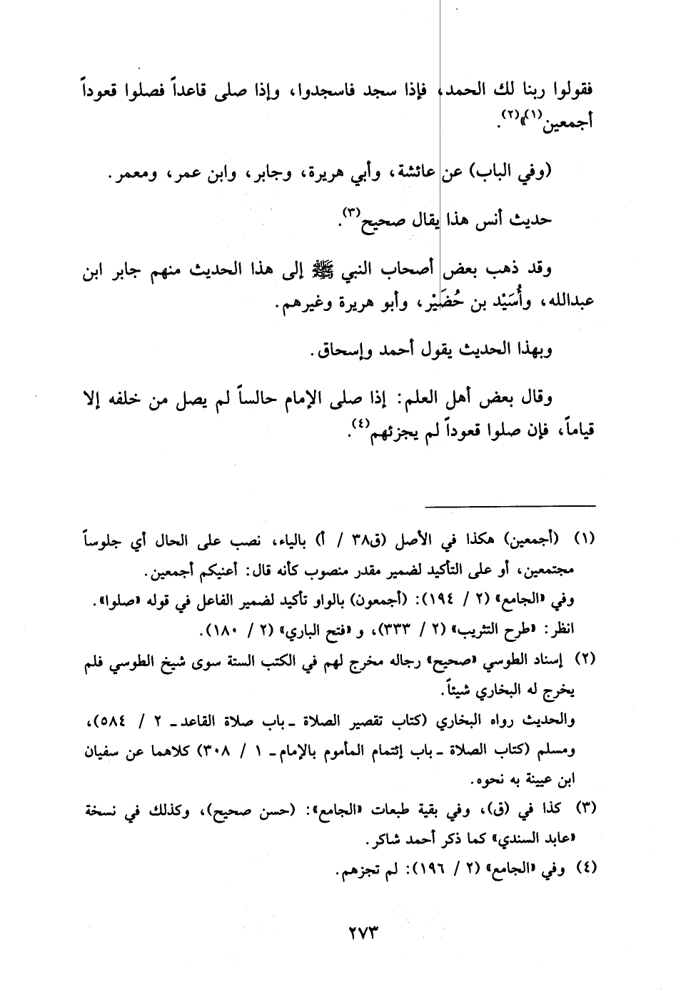 وَقَالَ بَعْضُ أَهْلِ الْعِلْمِ إِذَا صَلَّى الإِمَامُ جَالِسًا لَمْ يُصَلِّ مَنْ خَلْفَهُ إِلا قِيَامًا فَإِنْ صولا قُعُودًا لَمْ يُجْزِئْهُمْ