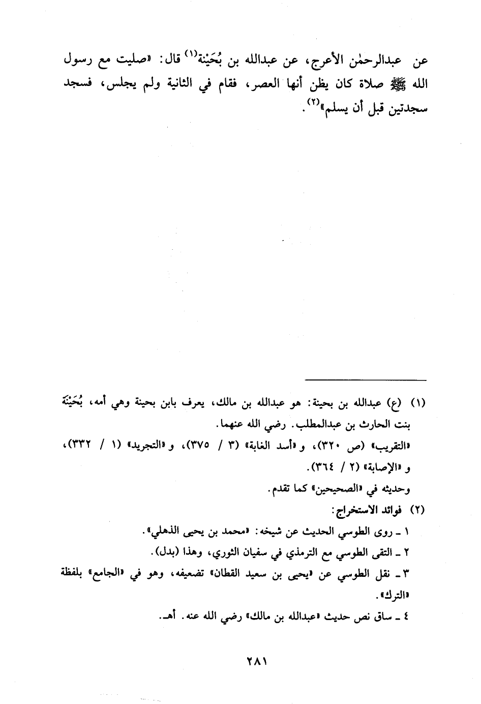 عَنْ عَبْدِ الرَّحْمَنِ الأَعْرَجِ عَنْ عَبْدِ اللَّهِ بْنِ بُحَيْنَةَ قَالَ صَلَّيْتُ مَعَ رَسُولِ اللَّهِ صَلَّى اللَّهُ عَلَيْهِ وَسَلَّمَ صَلاةً كَانَ يَظُنُّ أَنَّهَا الْعَصْرُ فَقَامَ فِي الثَّانِيَةِ وَلَمْ يَجْلِسْ فَسَجَدَ سَجْدَتَيْنِ قَبْلَ أَنْ يُسَلِّمَ