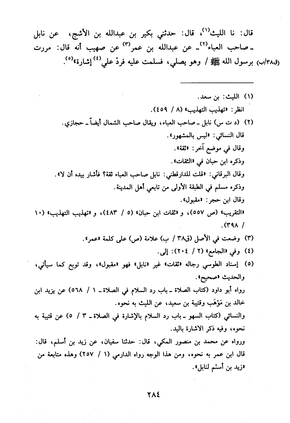قَالَ نَا اللَّيْثُ قَالَ حَدَّثَنِي بُكَيْرُ بْنُ عَبْدِ اللَّهِ بْنِ الأَشَجِّ عَنْ نَابِلٍ صَاحِبِ الْعبَاءِ عَنْ عَبْدِ اللَّهِ بْنِ عُمَرَ عَنْ صُهَيْبٍ أَنَّهُ قَالَ مَرَرْتُ بِرَسُولِ اللَّهِ صَلَّى اللَّهُ عَلَيْهِ وَسَلَّمَ وَهُوَ يُصَلِّي فَسَلَّمْتُ عَلَيْهِ فَرَدَّ عَلَيَّ إِشَارَةً