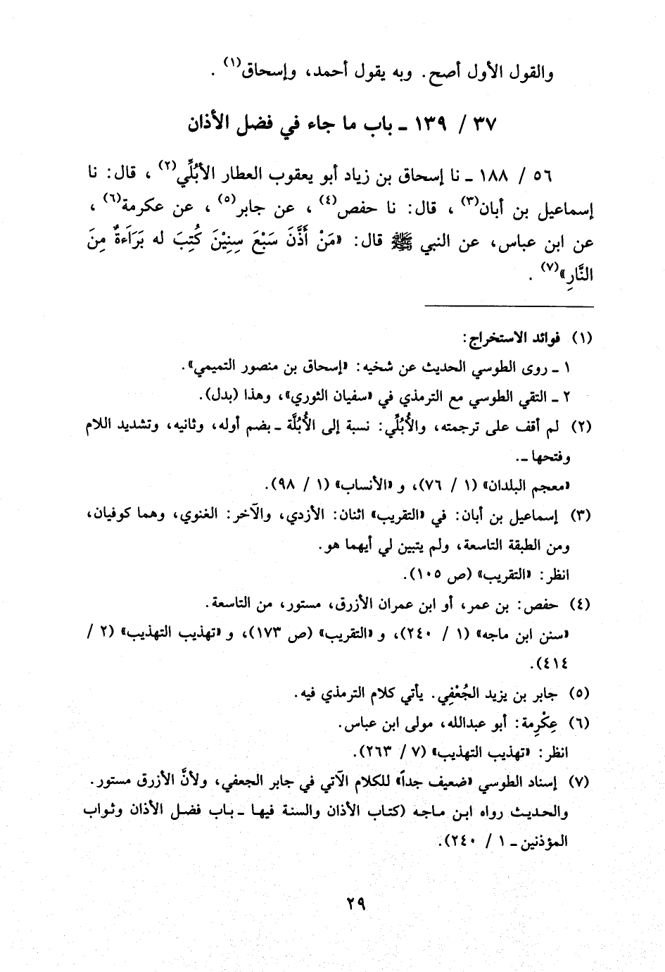 56 - / 188 نَا إِسْحَاقُ بْنُ زِيَادٍ أَبُو يَعْقُوبَ الْعَطَّارُ الأُبُلِّيُّ قَالَ نَا إِسْمَاعِيلُ بْنُ أَبَانٍ قَالَ نَا حَفْصٌ عَنْ جَابِرٍ عَنْ عِكْرِمَةَ عَنِ ابْنِ عَبَّاسٍ عَنِ النَّبِيِّ صَلَّى اللَّهُ عَلَيْهِ وَسَلَّمَ قَالَ مَنْ أَذَّنَ سَبْعَ سِنِينَ كُتِبَ لَهُ بَرَاءَةٌ مِنَ النَّارِ
