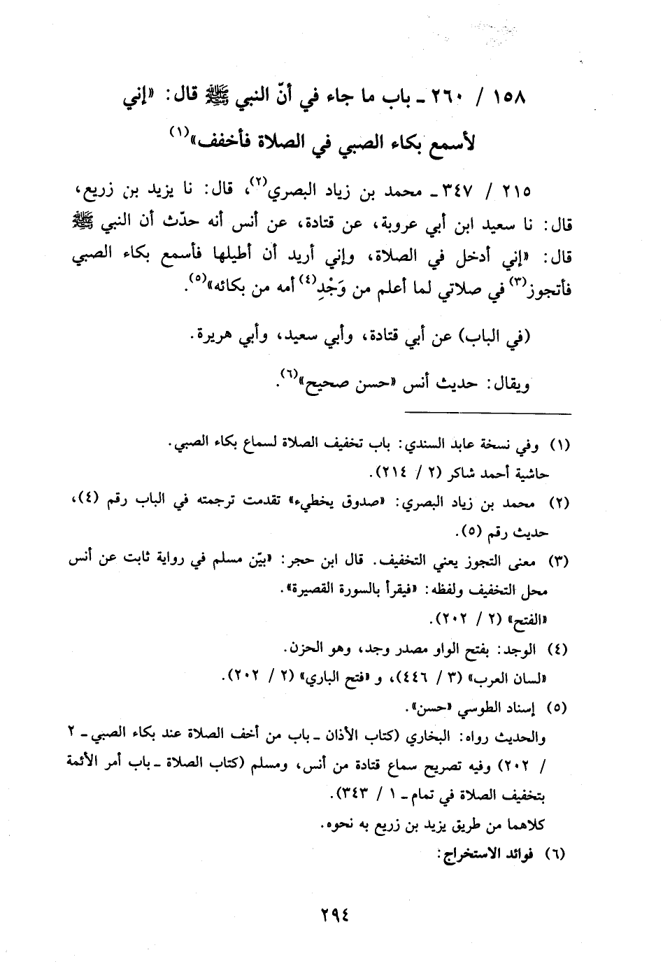 158 - / 260 بَابُ مَا جَاءَ فِي أَنَّ النَّبِيَّ صَلَّى اللَّهُ عَلَيْهِ وَسَلَّمَ قَالَ إِنِّي لأَسْمَعُ بُكَاءَ الصَّبِيِّ فِي الصَّلاةِ فَأُخَفِّفُ