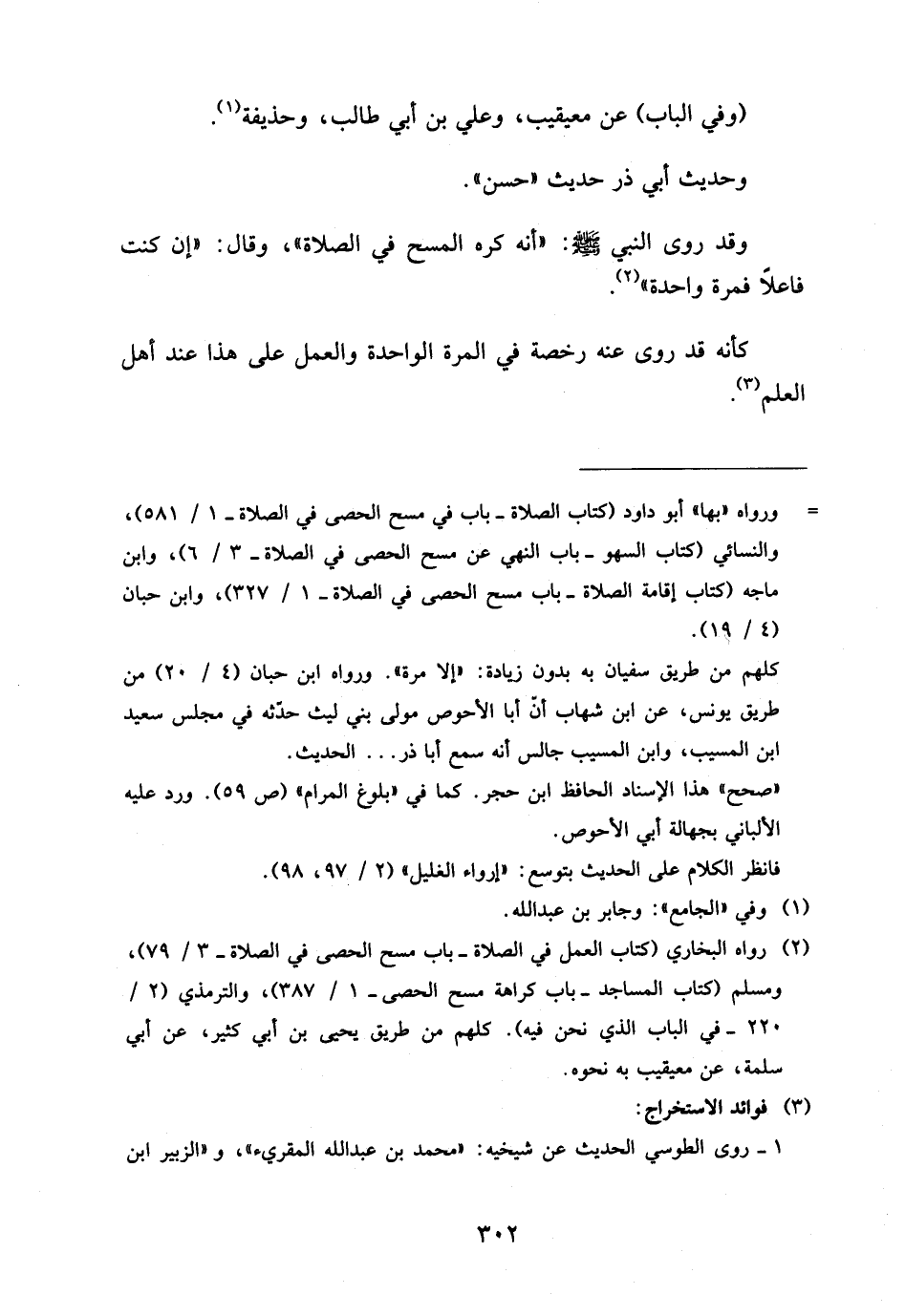 وَقَدْ رَوَى النَّبِيُّ صَلَّى اللَّهُ عَلَيْهِ وَسَلَّمَ أَنَّهُ كَرِهَ الْمَسْحَ فِي الصَّلاةِ وَقَالَ إِنْ كُنْتَ فَاعِلا فَمَرَّةً وَاحِدَةً