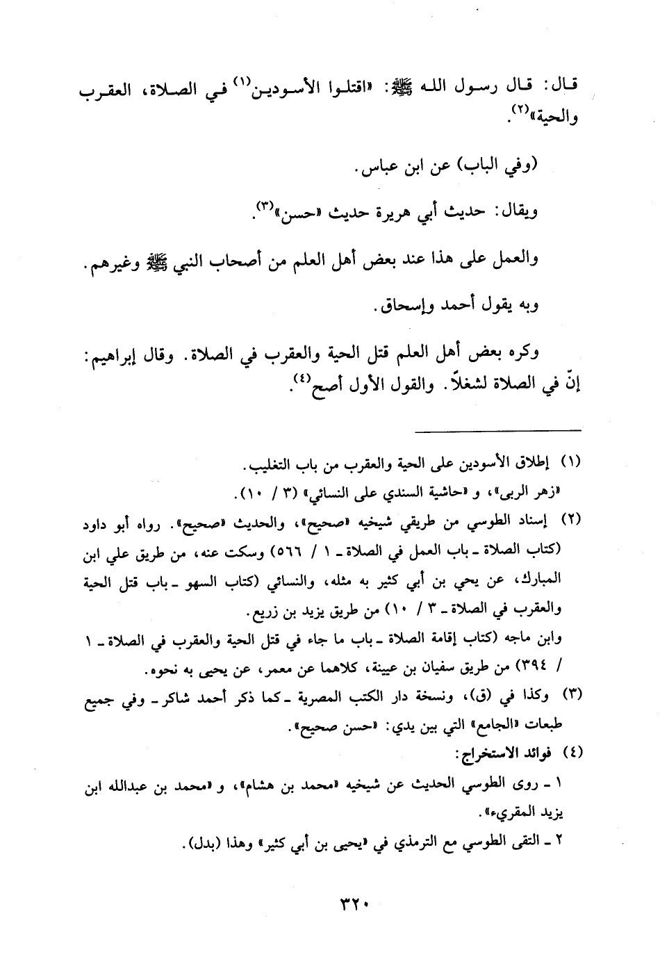 وَكَرِهَ بَعْضُ أَهْلِ الْعِلْمِ قَتْلَ الْحَيَّةِ وَالْعَقْرَبِ فِي الصَّلاةِ وَقَالَ إِبْرَاهِيمُ إِنَّ فِي الصَّلاةِ لَشُغُلا وَالْقَوْلُ الأَوَّلُ أَصَحُّ