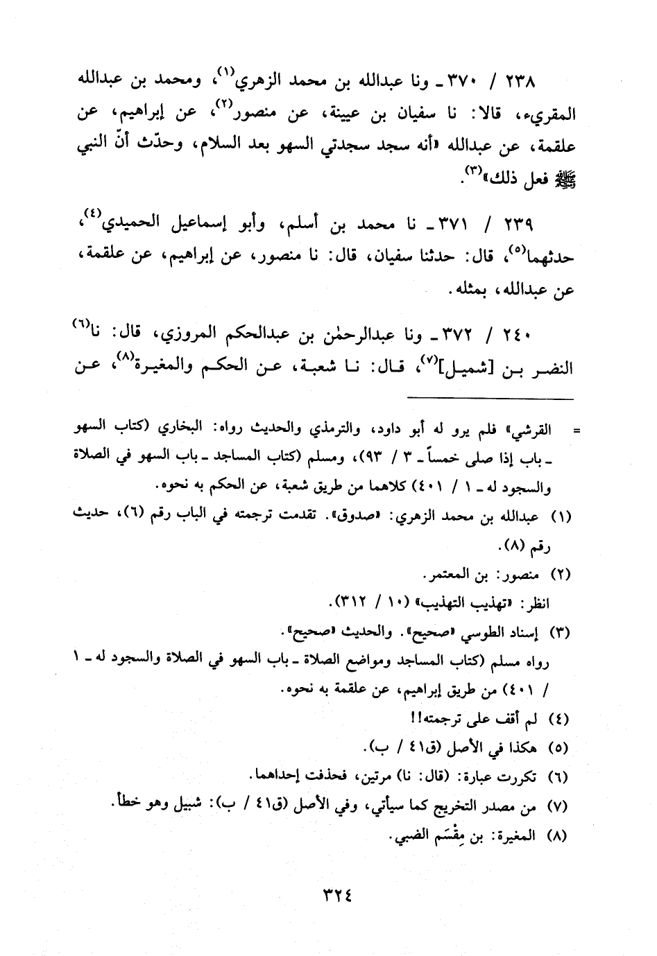 238 - / 370 وَنا عَبْدُ اللَّهِ بْنُ مُحَمَّدٍ الزُّهْرِيُّ وَمُحَمَّدُ بن عبد الله المقريء قَالا نَا سُفْيَانُ بْنُ عُيَيْنَةَ عَنْ مَنْصُورٍ عَنْ إِبْرَاهِيمَ عَنْ عَلْقَمَةَ عَنْ عَبْدِ اللَّهِ أَنَّهُ سَجَدَ سَجْدَتَيِ السَّهْوِ بَعْدَ السَّلامِ وَحَدَّثَ أَنَّ النَّبِيَّ صَلَّى اللَّهُ عَلَيْهِ وَسَلَّمَ فَعَلَ ذَلِكَ