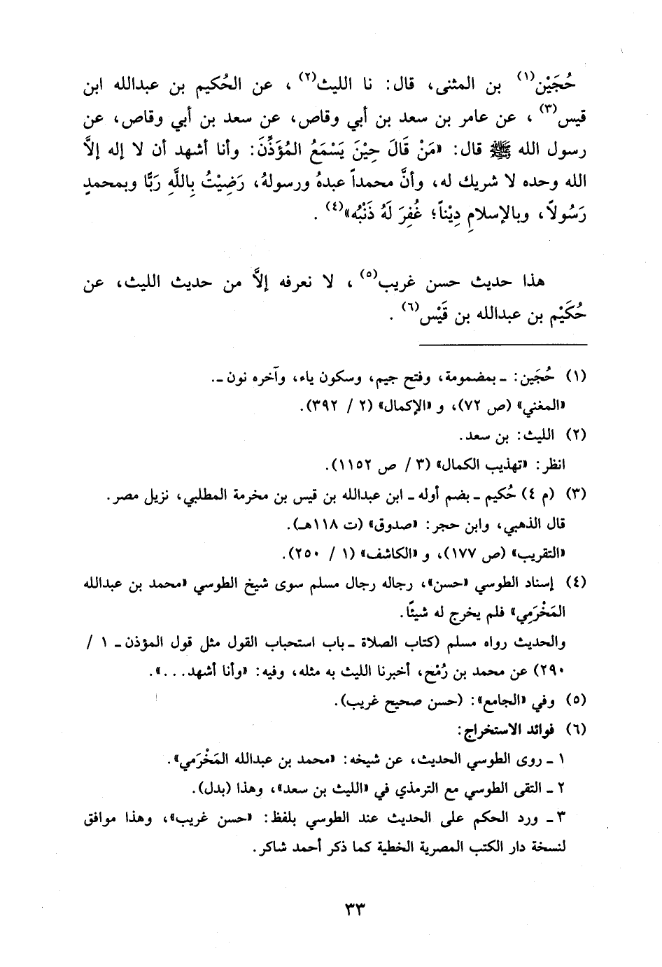 حُجَيْنُ بْنُ الْمُثَنَّى قَالَ نَا اللَّيْثُ عَنِ الْحَكِيم بن عبد الله ابْن قيس عَامِرِ بْنِ سَعْدِ بْنِ أَبِي وَقَّاصٍ عَنْ سَعْدِ بْنِ أَبِي وَقَّاصٍ عَنْ رَسُولِ اللَّهِ صَلَّى اللَّهُ عَلَيْهِ وَسَلَّمَ قَالَ مَنْ قَالَ حِينَ يَسْمَعُ الْمُؤَذِّنَ وَأَنَا أَشْهَدُ أَنْ لَا إِلَهَ إِلا اللَّهُ وَحْدَهُ لَا شَرِيكَ لَهُ وَأَنَّ مُحَمَّدًا عَبْدُهُ وَرَسُولُهُ رَضِيتُ بِاللَّهِ رَبًّا وَبِمُحَمَّدٍ رَسُولا وَبِالإِسْلامِ دِينًا غُفِرَ لَهُ ذَنْبُهُ