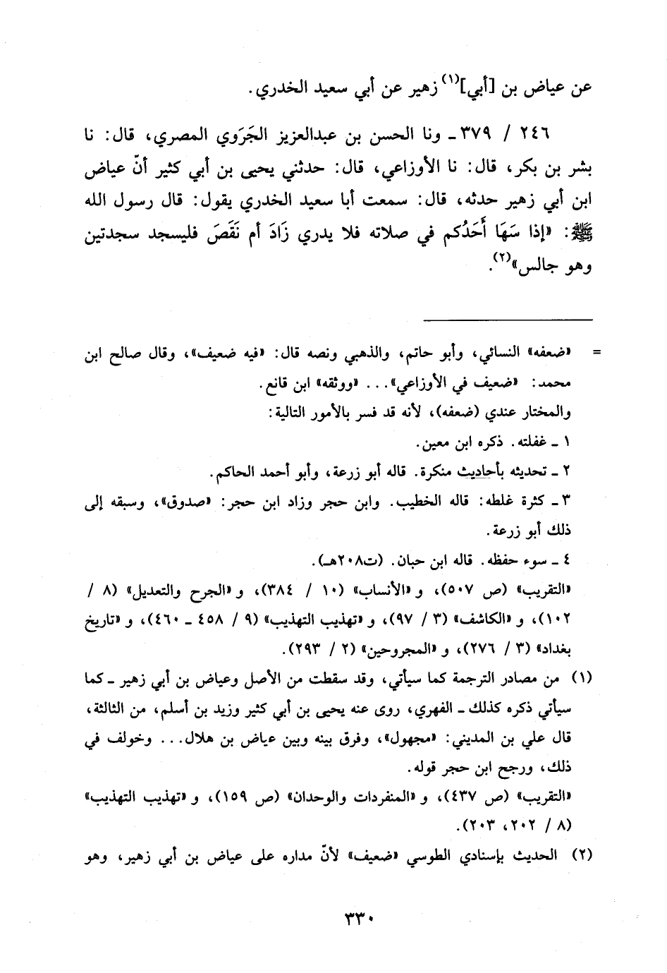 246 - / 379 وَنا الْحَسَنُ بْنُ عَبْدِ الْعَزِيزِ الْجَرَوِيُّ الْمِصْرِيُّ قَالَ نَا بِشْرُ بْنُ بَكْرٍ قَالَ نَا الأَوْزَاعِيُّ قَالَ حَدَّثَنِي يَحْيَى بْنُ أبي كثير أَن عِيَاض ابْن أَبِي زُهَيْرٍ حَدَّثَهُ قَالَ سَمِعْتُ أَبَا سَعِيدٍ الْخُدْرِيَّ يَقُولُ قَالَ رَسُولُ اللَّهِ صَلَّى اللَّهُ عَلَيْهِ وَسَلَّمَ إِذَا سَهَا أَحَدُكُمْ فِي صَلاتِهِ فَلا يَدْرِي زَادَ أَمْ نَقَصَ فَلْيَسْجُدْ سَجْدَتَيْنِ وَهُوَ جَالس