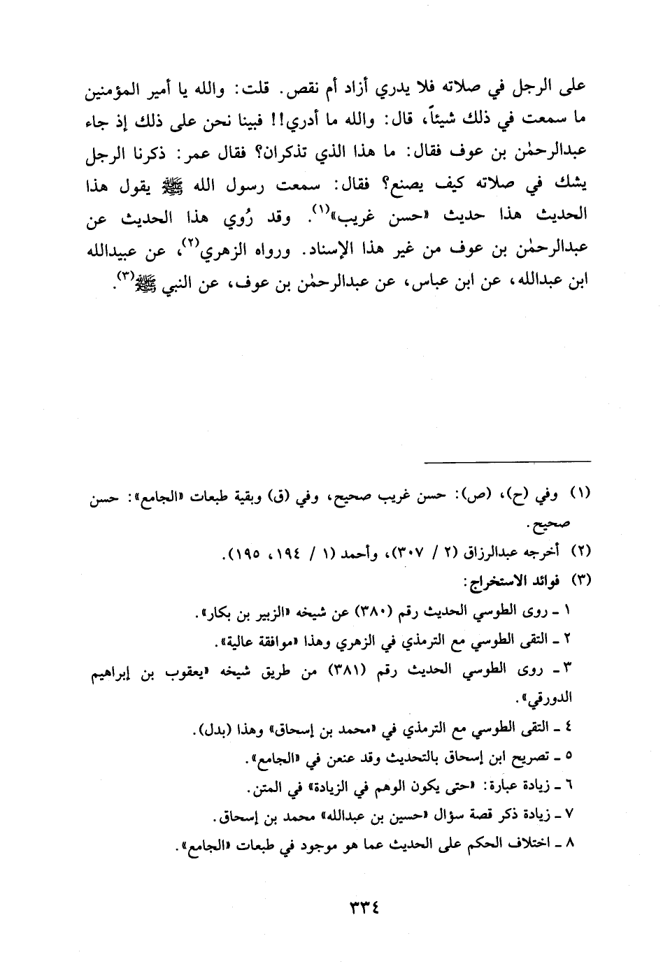 عَلَى الرَّجُلِ فِي صَلاتِهِ فَلا يَدْرِي أَزَادَ أَمْ نَقَصَ قُلْتُ وَاللَّهِ يَا أَمِيرَ الْمُؤْمِنِينَ مَا سَمِعْتُ فِي ذَلِكَ شَيْئًا قَالَ وَاللَّهِ مَا أَدْرِي فَبَيْنَا نَحْنُ عَلَى ذَلِكَ إِذْ جَاءَ عَبْدُ الرَّحْمَنِ بْنُ عَوْفٍ فَقَالَ مَا هَذَا الَّذِي تَذْكُرَانِ فَقَالَ عُمَرُ ذَكَرْنَا الرَّجُلَ يَشُكُّ فِي صَلاتِهِ كَيْفَ يَصْنَعُ فَقَالَ سَمِعْتُ رَسُولَ اللَّهِ صَلَّى اللَّهُ عَلَيْهِ وَسَلَّمَ يَقُولُ هَذَا الْحَدِيثَ هَذَا حَدِيثٌ حَسَنٌ غَرِيبٌ وَقَدْ رُوِيَ هَذَا الْحَدِيثُ عَنْ عَبْدِ الرَّحْمَنِ بْنِ عَوْفٍ مِنْ غَيْرِ هَذَا الإِسْنَادِ وَرَوَاهُ الزُّهْرِيُّ عَن عبيد الله ابْن عَبْدِ اللَّهِ عَنِ ابْنِ عَبَّاسٍ عَنْ عَبْدِ الرَّحْمَنِ بْنِ عَوْفٍ عَنِ النَّبِيِّ صَلَّى اللَّهُ عَلَيْهِ وَسلم