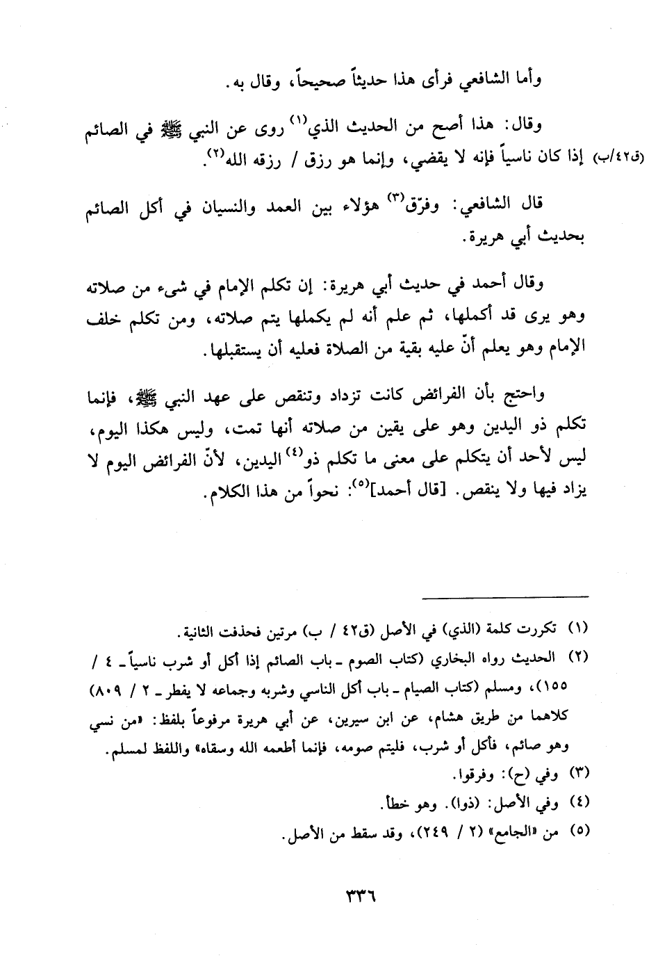 وَاحْتَجَّ بِأَنَّ الْفَرَائِضَ كَانَتْ تَزْدَادُ وَتَنْقُصُ عَلَى عَهْدِ النَّبِيِّ صَلَّى اللَّهُ عَلَيْهِ وَسَلَّمَ فَإِنَّمَا تَكَلَّمَ ذُو الْيَدَيْنِ وَهُوَ عَلَى يَقِينٍ مِنْ صَلاتِهِ أَنَّهَا تَمَّتْ وَلَيْسَ هَكَذَا الْيَوْمَ لَيْسَ لأَحَدٍ أَنْ يَتَكَلَّمَ عَلَى مَعْنَى مَا تَكَلَّمَ ذُو الْيَدَيْنِ لأَنَّ الْفَرَائِضَ الْيَوْمَ لَا يُزَادُ فِيهَا وَلا يَنْقُصُ قَالَ أَحْمَدُ نَحْوًا مِنْ هَذَا الْكَلامِ