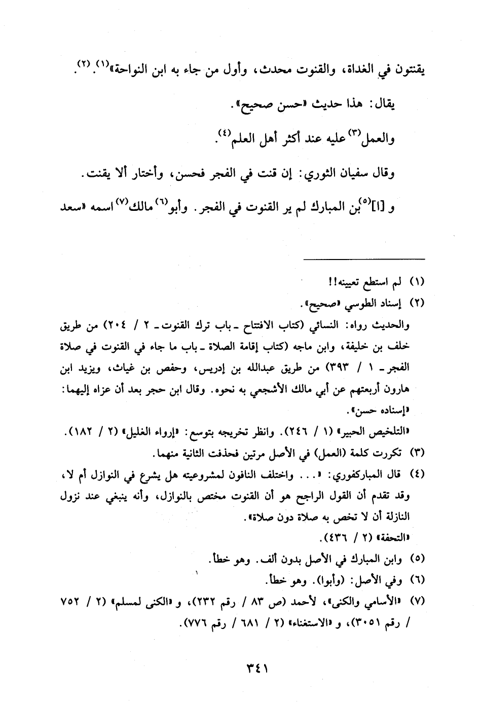 وَابْنُ الْمُبَارَكِ لَمْ يَرَ الْقُنُوتَ فِي الْفَجْرِ وَأَبُو مَالِكٍ اسْمه سعد