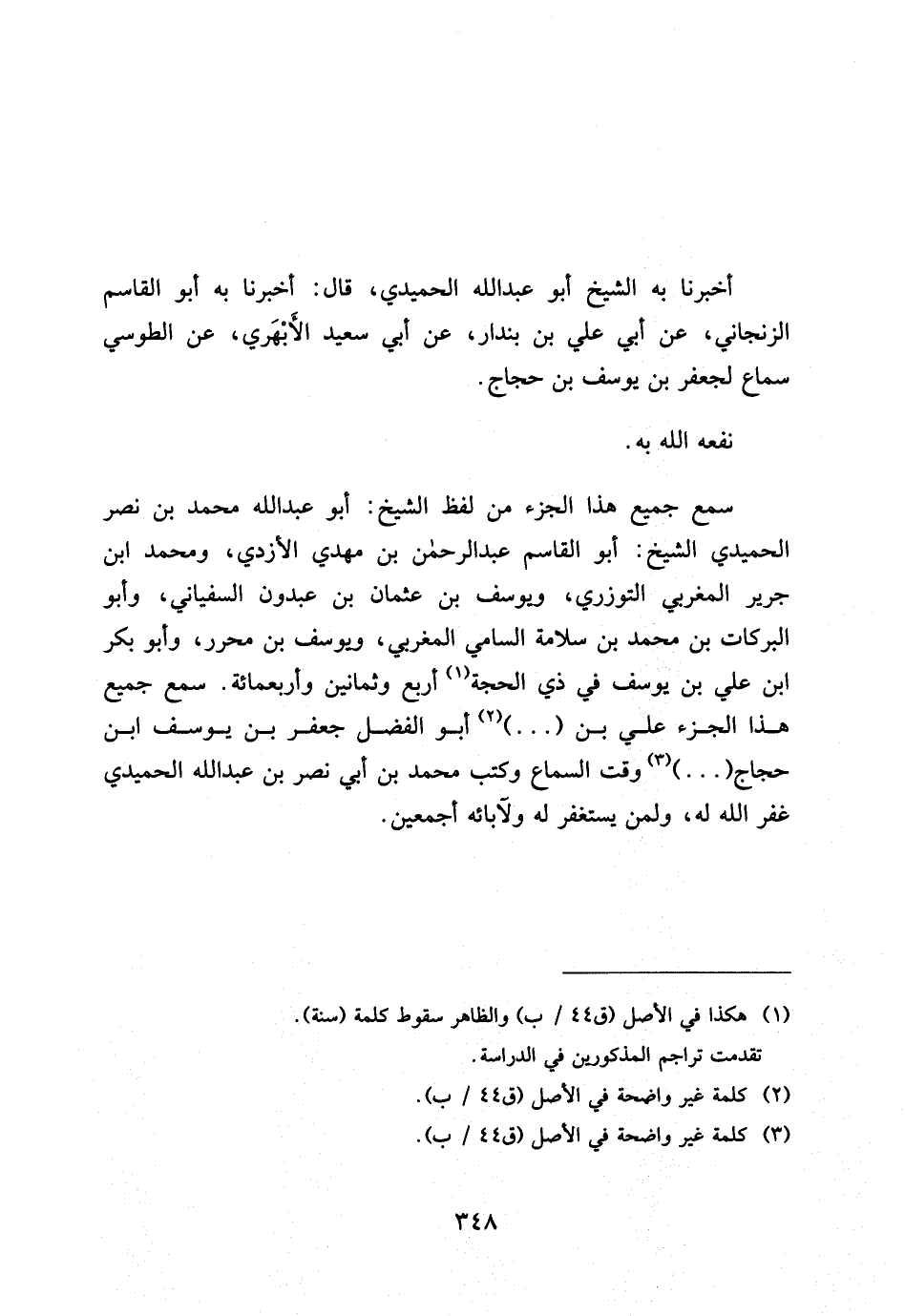 أَخْبَرَنَا بِهِ الشَّيْخُ أَبُو عَبْدِ اللَّهِ الْحُمَيْدِيُّ قَالَ أَخْبَرَنَا بِهِ أَبُو الْقَاسِمِ الزَّنْجَانِيُّ عَنْ أَبِي عَلِيِّ بْنِ بُنْدَارٍ عَنْ أَبِي سَعِيدٍ الأَبْهَرِيِّ عَنِ الطُّوسِيِّ سَمَاعٌ لِجَعْفَرِ بْنِ يُوسُفَ بْنِ حَجَّاجٍ