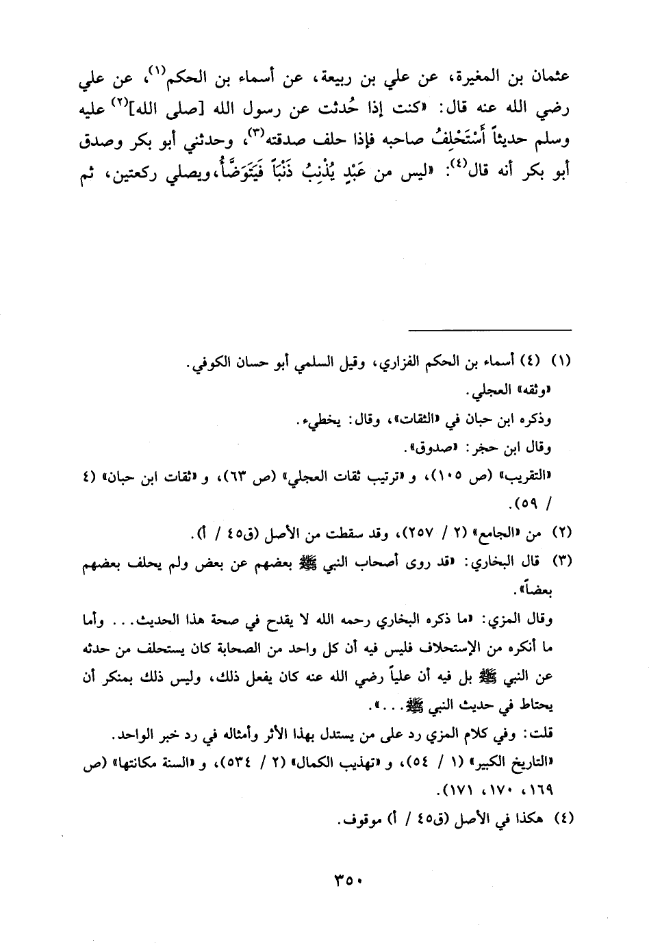 عُثْمَان بن الْمُغيرَة عَن عَليّ عَن ربيعَة عَن أَسمَاء بن الحكم بن عَلِيٍّ رَضِيَ اللَّهُ عَنْهُ قَالَ كُنْتُ إِذَا حُدِّثْتُ عَنْ رَسُولِ اللَّهِ صَلَّى اللَّهُ عَلَيْهِ وَسَلَّمَ حَدِيثًا أَسْتَحْلِفُ صَاحِبَهُ فَإِذَا حَلَفَ صَدَّقْتُهُ وَحَدَّثَنِي أَبُو بَكْرٍ وَصَدَقَ أَبُو بَكْرٍ أَنَّهُ قَالَ لَيْسَ مِنْ عَبْدٍ يُذْنِبُ ذَنْبًا فَيَتَوَضَّأُ وَيُصَلِّي رَكْعَتَيْنِ ثُمَّ
