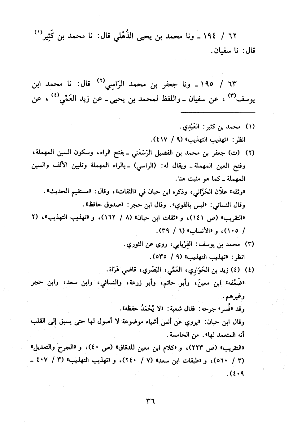 62 - / 194 ونا مُحَمَّدُ بْنُ يَحْيَى الذُّهْلِيُّ قَالَ نَا مُحَمَّدُ بْنُ كَثِيرٍ قَالَ نَا سُفْيَانُ