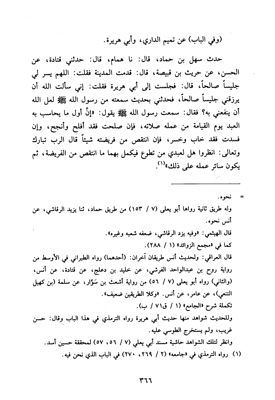 حَدَّثَ سَهْلُ بْنُ حَمَّادٍ قَالَ نَا هَمَّامٌ قَالَ حَدَّثَنِي قَتَادَةُ عَنِ الْحَسَنِ عَنْ حُرَيْثِ بْنِ قَبِيصَةَ قَالَ قَدِمْتُ الْمَدِينَةَ فَقُلْتُ اللَّهُمَّ يَسِّرْ لِي جَلِيسًا صَالِحًا قَالَ فَجَلَسْتُ إِلَى أَبِي هُرَيْرَةَ فَقُلْتُ إِنِّي سَأَلْتُ اللَّهَ أَنْ يَرْزُقَنِي جَلِيسًا صَالِحًا فَحَدِّثْنِي بِحَدِيثٍ سَمِعْتَهُ مِنْ رَسُولِ اللَّهِ صَلَّى اللَّهُ عَلَيْهِ وَسَلَّمَ لَعَلَّ اللَّهَ أَنْ يَنْفَعَنِي بِهِ فَقَالَ سَمِعْتُ رَسُولَ اللَّهِ صَلَّى اللَّهُ عَلَيْهِ وَسَلَّمَ يَقُولُ إِنَّ أَوَّلَ مَا يُحَاسَبُ بِهِ الْعَبْدُ يَوْمَ الْقِيَامَةِ مِنْ عَمَلِهِ صَلاتُهُ فَإِنْ صَلُحَتْ فَقَدْ أَفْلَحَ وَأَنْجَحَ وَإِنْ فَسَدَتْ فَقَدْ خَابَ وَخَسِرَ فَإِنِ انْتَقَصَ مِنْ فَرِيضَتِهِ شَيْئًا قَالَ الرَّبُّ تَبَارَكَ وَتَعَالَى انْظُرُوا هَلْ لِعَبْدِي مِنْ تَطَوُّعٍ فَيُكْمِلُ بِهِمَا مَا انْتَقَصَ مِنَ الْفَرِيضَةِ ثُمَّ يَكُونُ سَائِرُ عَمَلِهِ عَلَى ذَلِكَ