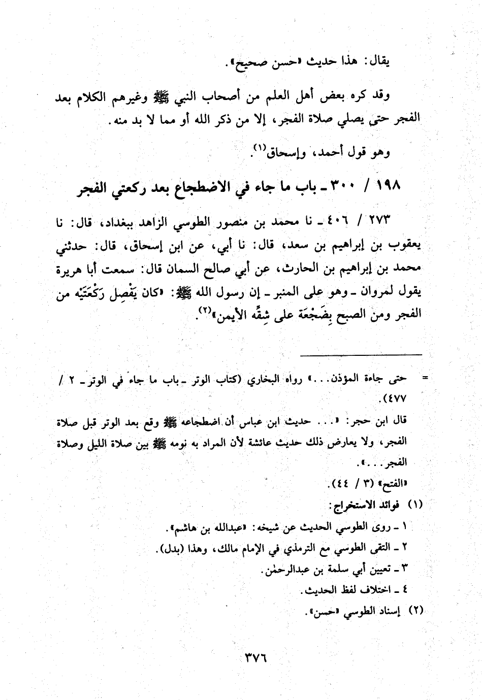 273 - / 406 نَا مُحَمَّدُ بْنُ مَنْصُورٍ الطُّوسِيُّ الزَّاهِدُ بِبَغْدَادَ قَالَ نَا يَعْقُوبُ بْنُ إِبْرَاهِيمَ بْنِ سَعْدٍ قَالَ نَا أَبِي عَنِ ابْنِ إِسْحَاقَ قَالَ حَدَّثَنِي مُحَمَّدُ بْنُ إِبْرَاهِيمَ بْنِ الْحَارِثِ عَنْ أَبِي صَالِحٍ السَّمَّانِ قَالَ سَمِعْتُ أَبَا هُرَيْرَةَ يَقُولُ لِمَرْوَانَ وَهُوَ عَلَى الْمِنْبَرِ إِنَّ رَسُولَ اللَّهِ صَلَّى اللَّهُ عَلَيْهِ وَسَلَّمَ كَانَ يَفْصِلُ رَكْعَتَيْهِ مِنَ الْفَجْرِ وَمِنَ الصُّبْحِ بِضَجْعَةٍ عَلَى شِقِّهِ الأَيْمَنِ