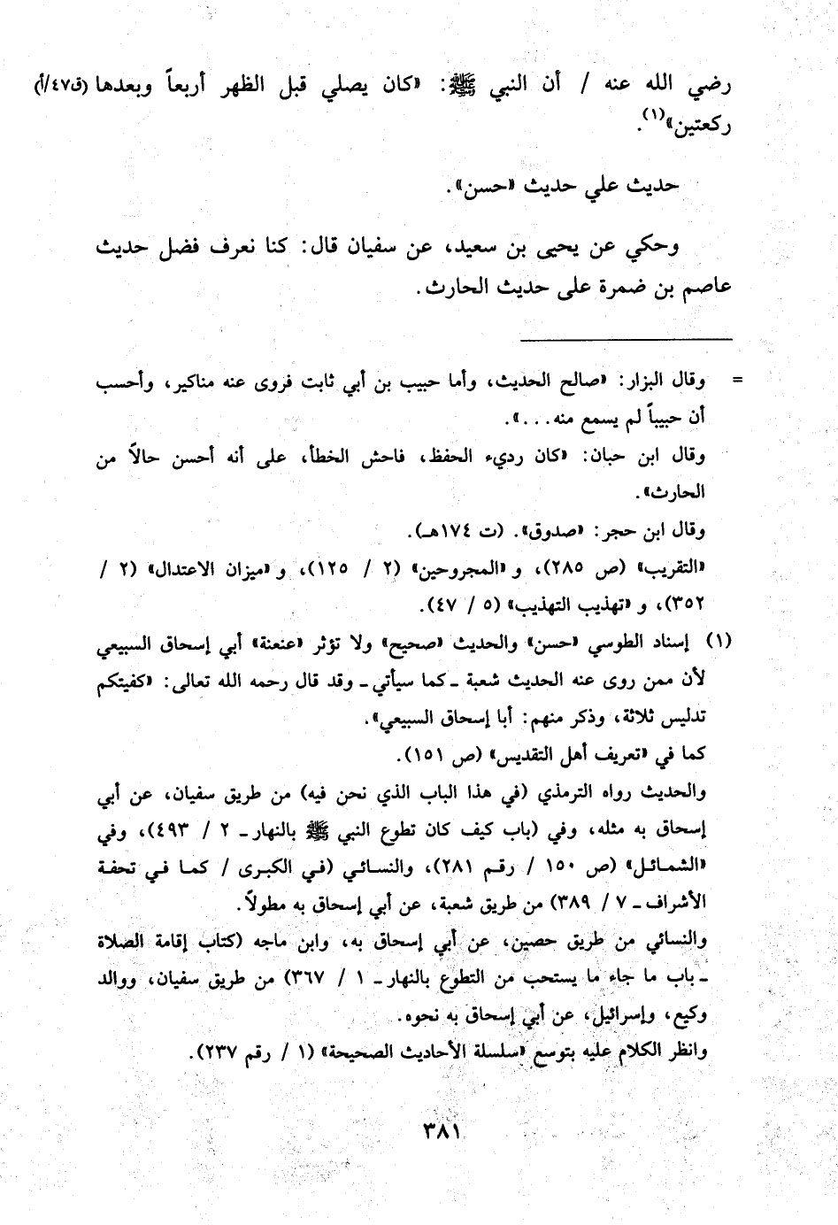 وَحُكِيَ عَنْ يَحْيَى بْنِ سَعِيدٍ عَنْ سُفْيَانَ قَالَ كُنَّا نَعْرِفُ فَضْلَ حَدِيثِ عَاصِمِ بْنِ ضَمْرَةَ عَلَى حَدِيثِ الْحَارِثِ