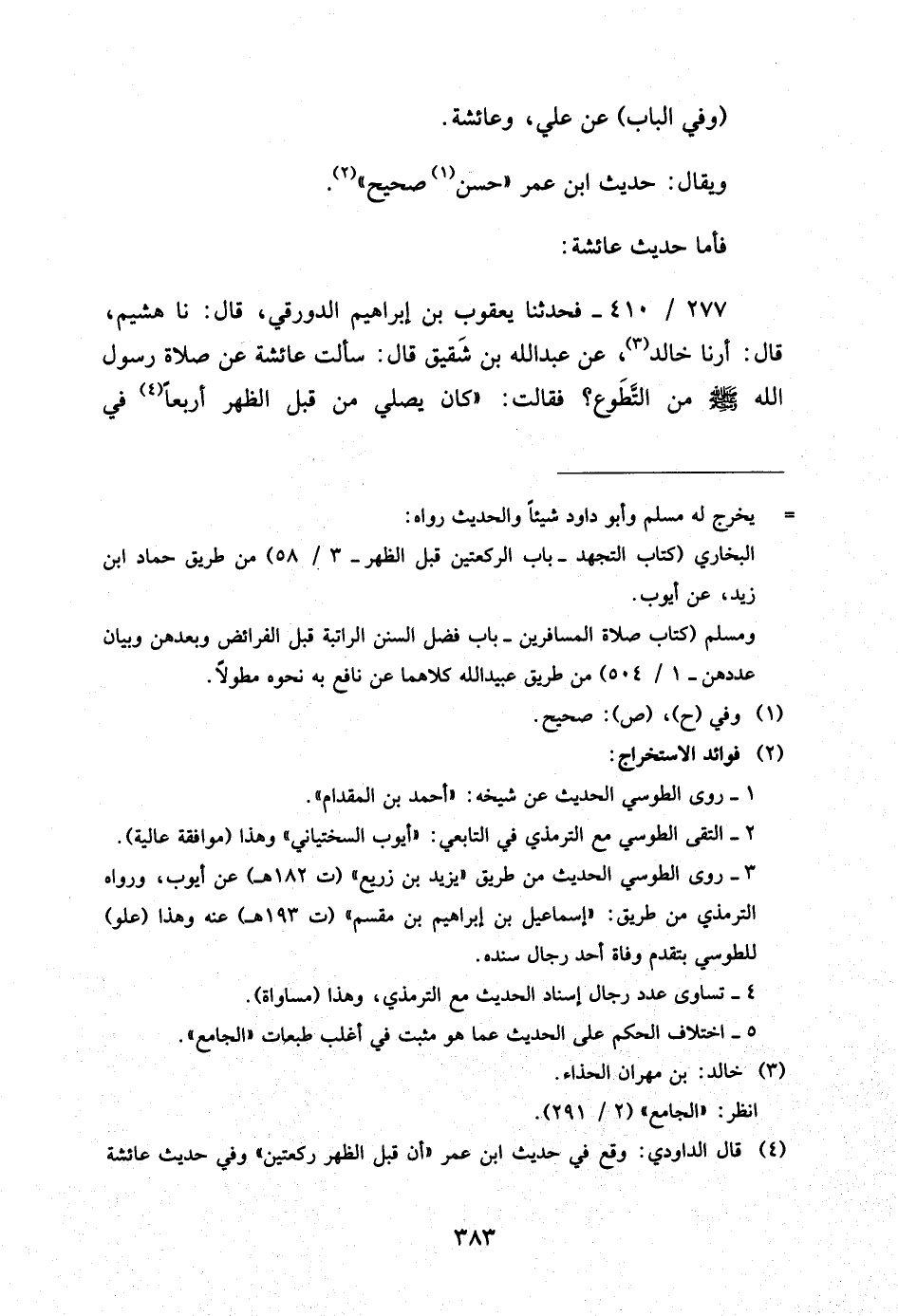 277 - / 410 فَحَدَّثَنَا يَعْقُوبُ بْنُ إِبْرَاهِيمَ الدَّوْرَقِيُّ قَالَ نَا هشيم قَالَ أرنا خَالِدٌ عَنْ عَبْدِ اللَّهِ بْنِ شَقِيقٍ قَالَ سَأَلْتُ عَائِشَةَ عَنْ صَلاةِ رَسُولِ اللَّهِ صَلَّى اللَّهُ عَلَيْهِ وَسَلَّمَ مِنَ التَّطَوُّعِ فَقَالَتْ كَانَ يُصَلِّي مِنْ قَبْلَ الظُّهْرِ أَرْبَعًا فِي