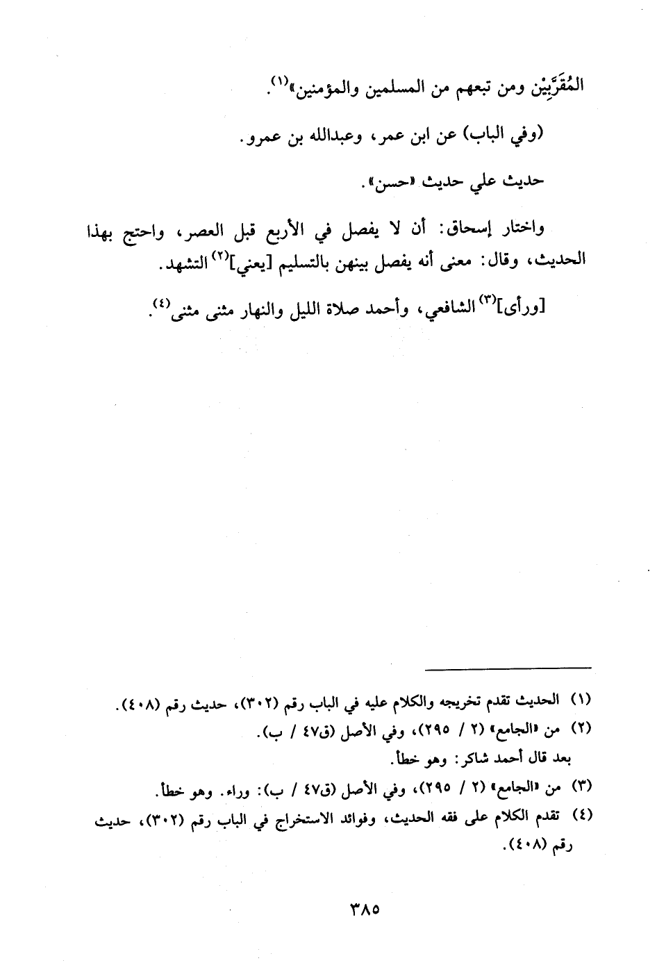 وَاخْتَارَ إِسْحَاقُ أَنْ لَا يَفْصِلَ فِي الأَرْبَعِ قَبْلَ الْعَصْرِ وَاحْتَجَّ بِهَذَا الْحَدِيثِ وَقَالَ مَعْنَى أَنَّهُ يَفْصِلُ بَيْنَهُنَّ بِالتَّسْلِيمِ يَعْنِي التَّشَهُّدَ