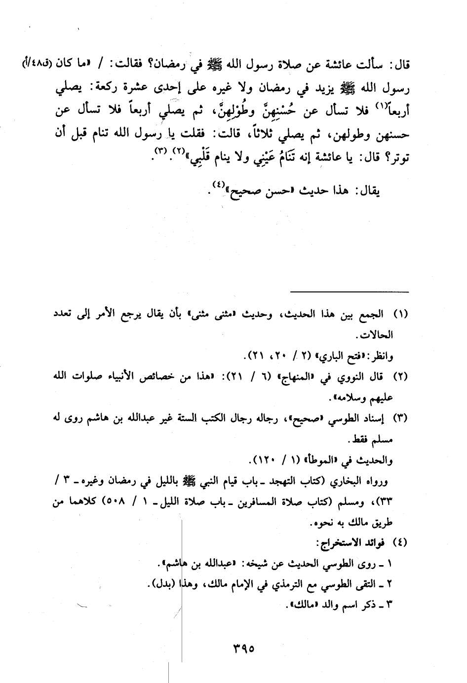 قَالَ سَأَلْتُ عَائِشَةَ عَنْ صَلاةِ رَسُولِ اللَّهِ صَلَّى اللَّهُ عَلَيْهِ وَسَلَّمَ فِي رَمَضَانَ فَقَالَتْ مَا كَانَ رَسُولُ اللَّهِ صَلَّى اللَّهُ عَلَيْهِ وَسَلَّمَ يَزِيدُ فِي رَمَضَانَ وَلا غَيْرِهِ عَلَى إِحْدَى عَشْرَةَ رَكْعَةً يُصَلِّي أَرْبَعًا فَلا تَسْأَلُ عَنْ حُسْنِهِنَّ وَطُولِهِنَّ ثُمَّ يُصَلِّي أَرْبَعًا فَلا تَسْأَلُ عَنْ حُسْنِهِنَّ وَطُولِهِنَّ ثُمَّ يُصَلِّي ثَلاثًا قَالَتْ فَقُلْتُ يَا رَسُولَ اللَّهِ تَنَامُ قَبْلَ أَنْ تُوتِرَ قَالَ يَا عَائِشَةُ إِنَّهُ تَنَامُ عَيْنِي وَلا يَنَامُ قَلْبِي