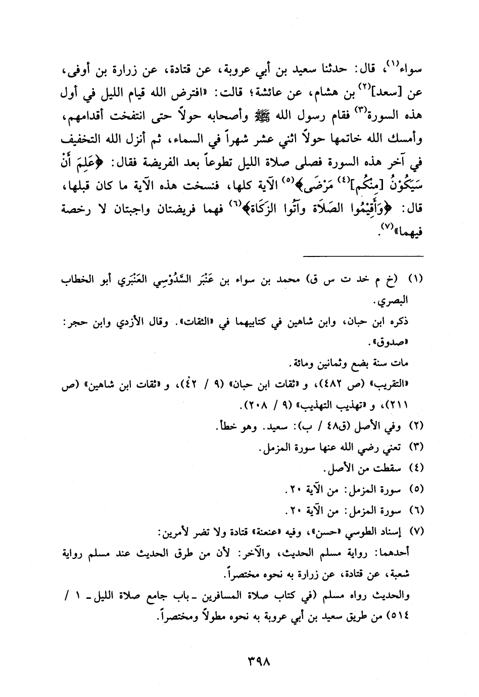 سَوَاءٍ قَالَ حَدَّثَنَا سَعِيدُ بْنُ أَبِي عَرُوبَةَ عَنْ قَتَادَةَ عَنْ زُرَارَةَ بْنِ أَوْفَى عَنْ سَعْدِ بْنِ هِشَامٍ عَنْ عَائِشَةَ قَالَتِ افْتَرَضَ اللَّهُ قِيَامَ اللَّيْلِ فِي أَوَّلِ هَذِهِ السُّورَةِ فَقَامَ رَسُولُ اللَّهِ صَلَّى اللَّهُ عَلَيْهِ وَسَلَّمَ وَأَصْحَابُهُ حَوْلا حَتَّى انْتَفَخَتْ أَقْدَامُهُمْ وَأَمْسَكَ اللَّهِ خَاتَمَهَا حَوْلا اثْنَيْ عَشَرَ شَهْرًا فِي السَّمَاءِ ثُمَّ أَنْزَلَ اللَّهُ التَّخْفِيفَ فِي آخِرِ هَذِهِ السُّورَةِ فَصَلَّى صَلاةَ اللَّيْلِ تَطَوُّعًا بَعْدَ الْفَرِيضَةِ فَقَالَ {علم أَن سَيكون مِنْكُم مرضى} الآيَةُ كُلُّهَا فَنَسَخَتْ هَذِهِ الآيَةُ مَا كَانَ قبلهَا قَالَ {وَأقِيمُوا الصَّلَاة وَآتوا الزَّكَاة} فَهُمَا فَرِيضَتَانِ وَاجِبَتَانِ لَا رُخْصَةَ فِيهِمَا