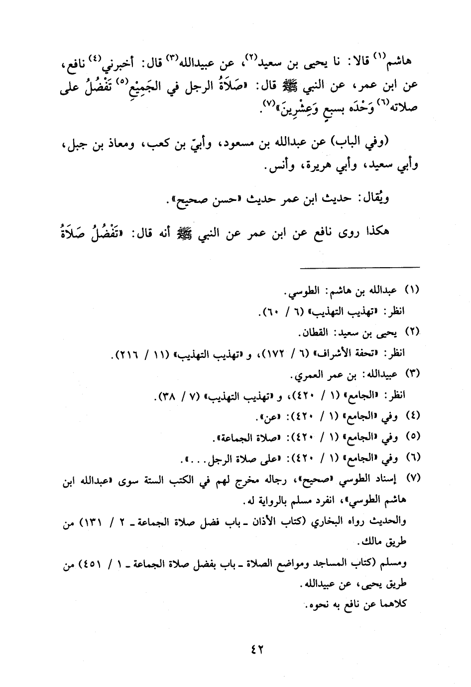 هَاشِمٍ قَالا نَا يَحْيَى بْنُ سَعِيدٍ عَنْ عُبَيْدِ اللَّهِ قَالَ أَخْبَرَنِي نَافِعٌ عَنِ ابْنِ عُمَرَ عَنِ النَّبِيِّ صَلَّى اللَّهُ عَلَيْهِ وَسَلَّمَ قَالَ صَلاةُ الرَّجُلِ فِي الْجَمِيعِ تَفْضُلُ عَلَى صَلاتِهِ وَحْدَهُ بِسَبْعٍ وَعِشْرِينَ