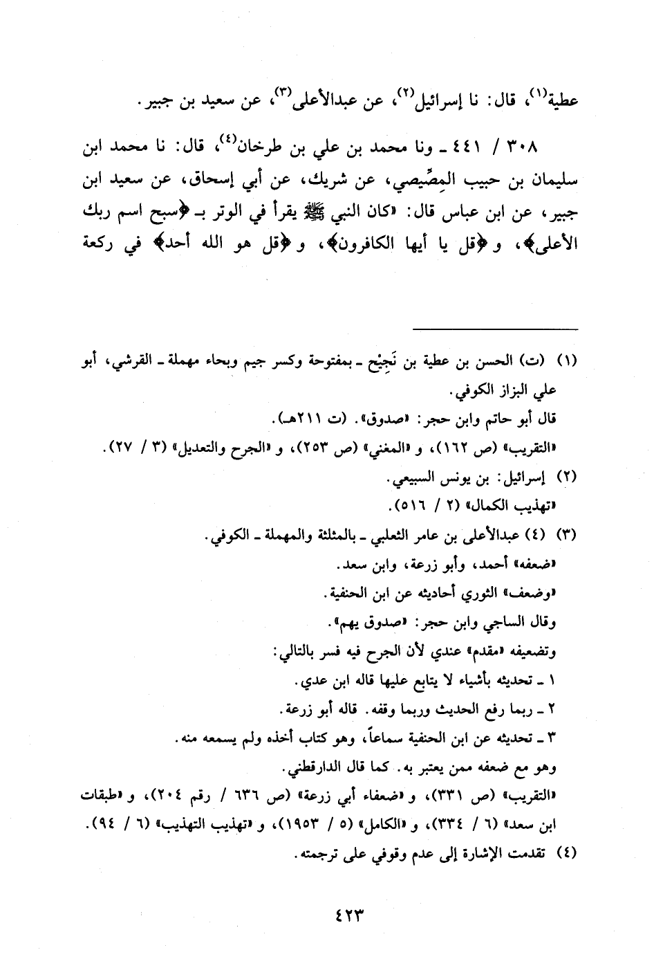 308 - / 441 وَنا مُحَمَّدُ بْنُ عَليّ بن طرخان قَالَ نَا مُحَمَّد ابْن سُلَيْمَانَ بْنِ حَبِيبٍ الْمِصِّيصِيُّ عَنْ شَرِيكٍ عَنْ أبي إِسْحَاق عَن سعيد ابْن جُبَيْرٍ عَنِ ابْنِ عَبَّاسٍ قَالَ كَانَ النَّبِيُّ صَلَّى اللَّهُ عَلَيْهِ وَسَلَّمَ يَقْرَأُ فِي الْوِتْرِ بِ {سَبِّحِ اسْمَ رَبِّكَ الأَعْلَى} وَ {قُلْ يَا أَيهَا الْكَافِرُونَ} وَ {قُلْ هُوَ اللَّهُ أَحَدٌ} فِي رَكْعَة