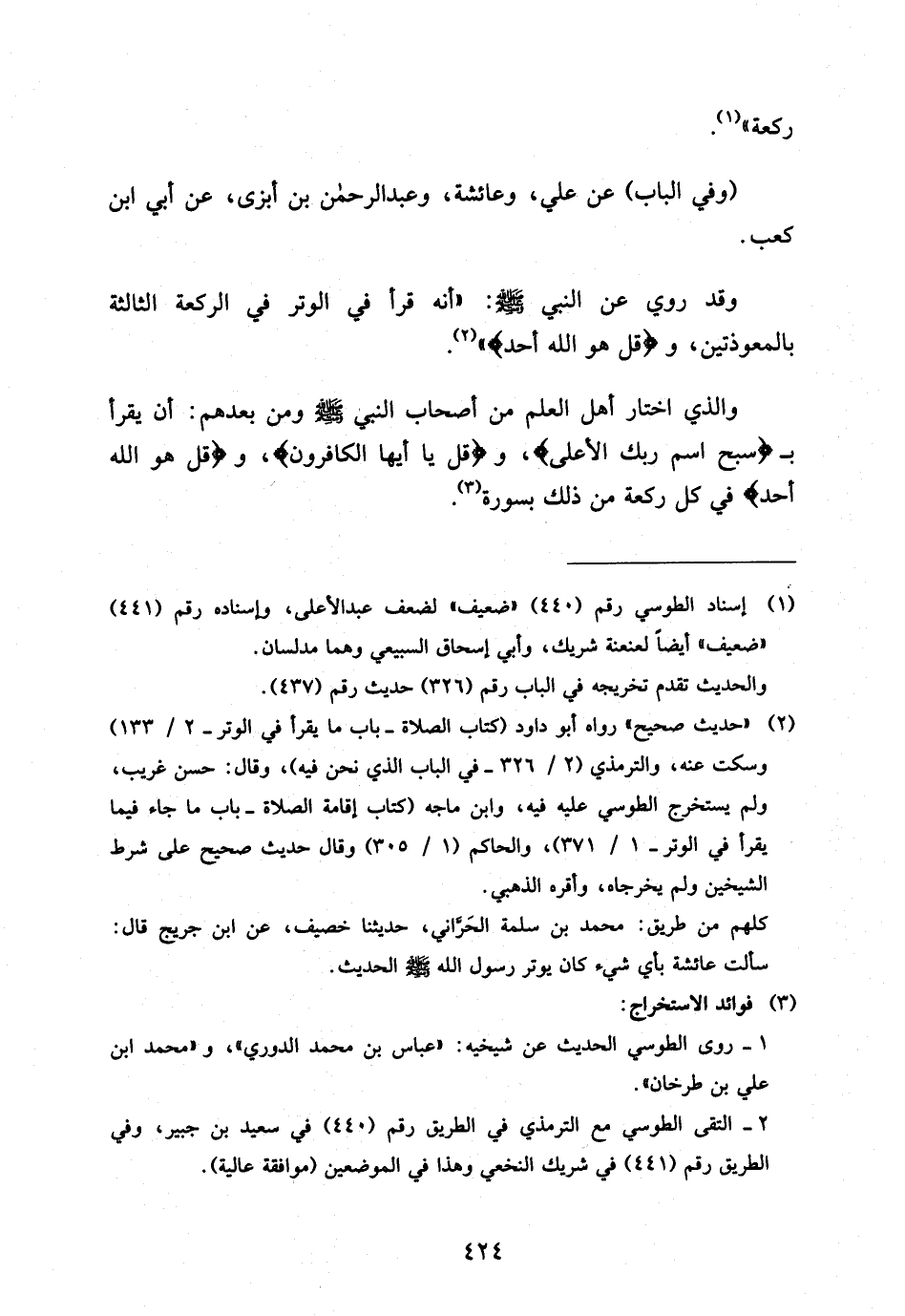 وَالَّذِي اخْتَارَ أَهْلُ الْعِلْمِ مِنْ أَصْحَابِ النَّبِيِّ صَلَّى اللَّهُ عَلَيْهِ وَسَلَّمَ وَمِنْ بَعْدِهِمْ أَنْ يُقْرَأَ بِ {سَبِّحِ اسْمَ رَبِّكَ الأَعْلَى} و {قل يَا أَيهَا الْكَافِرُونَ} وَ {قُلْ هُوَ اللَّهُ أَحَدٌ} فِي كُلِّ رَكْعَةٍ مِنْ ذَلِكَ بِسُورَةٍ