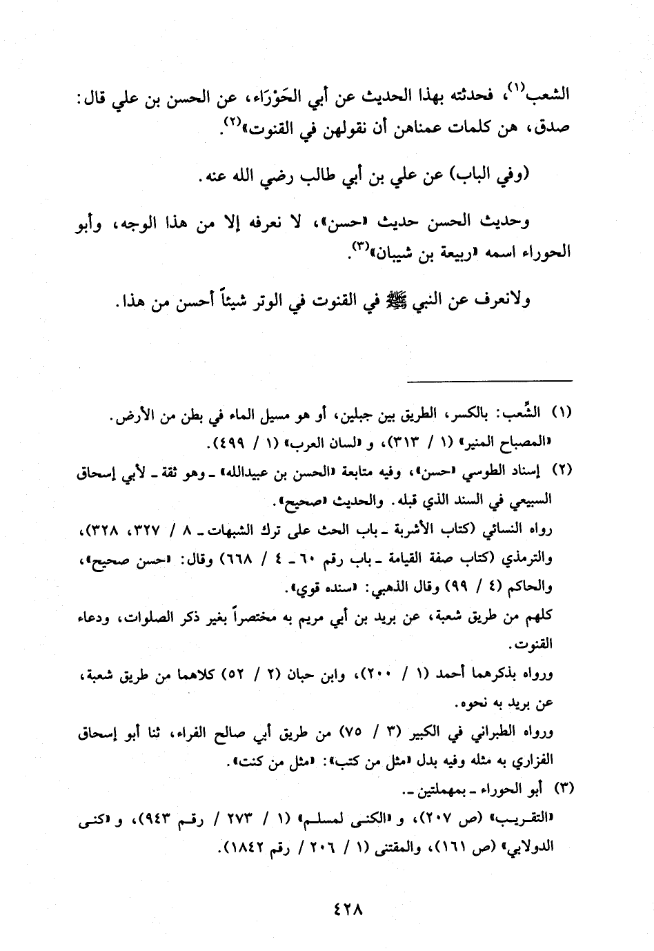 الشِّعْبِ فَحَدَّثْتُهُ بِهَذَا الْحَدِيثِ عَنْ أَبِي الْحَوْرَاءِ عَنِ الْحَسَنِ بْنِ عَلِيٍّ قَالَ صَدَقَ هُنَّ كَلِمَات عمناهن أَنْ نَقُولَهُنَّ فِي الْقُنُوتِ