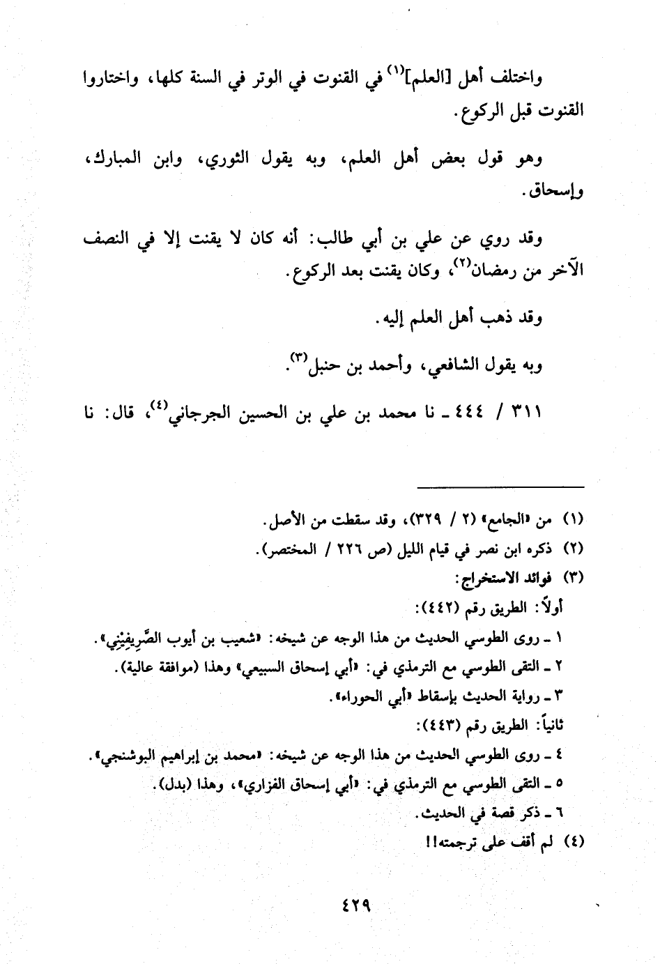 وَقَدْ رُوِيَ عَنْ عَلِيِّ بْنِ أَبِي طَالِبٍ أَنَّهُ كَانَ لَا يَقْنُتُ إِلا فِي النِّصْفِ الآخِرِ مِنْ رَمَضَانَ وَكَانَ يَقْنُتُ بَعْدَ الرُّكُوعِ