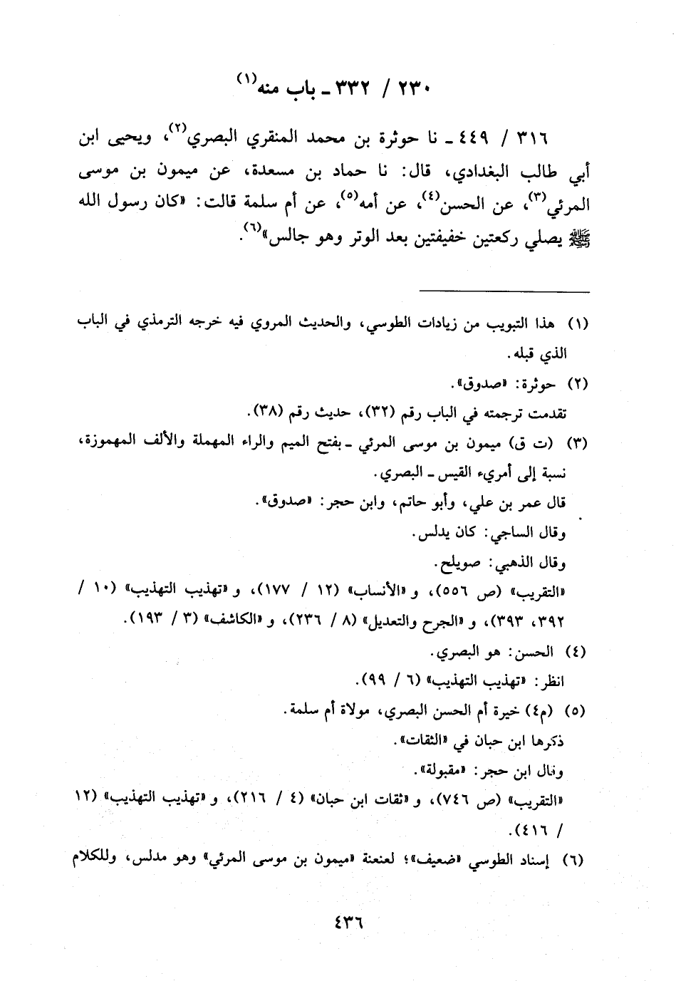 316 - / 449 نَا حَوْثَرَةُ بْنُ مُحَمَّدٍ الْمِنْقَرِيُّ الْبَصْرِيّ وَيحيى ابْن أَبِي طَالِبٍ الْبَغْدَادِيُّ قَالَ نَا حَمَّادُ بْنُ مَسْعَدَةَ عَنْ مَيْمُونِ بْنِ مُوسَى الْمَرَئِيِّ عَنِ الْحَسَنِ عَنْ أُمِّهِ عَنْ أُمِّ سَلَمَةَ قَالَتْ كَانَ رَسُولُ اللَّهِ صَلَّى اللَّهُ عَلَيْهِ وَسَلَّمَ يُصَلِّي رَكْعَتَيْنِ خَفِيفَتَيْنِ بَعْدَ الْوِتْرِ وَهُوَ جَالِسٌ