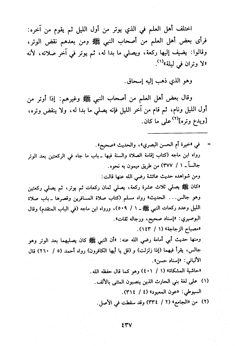 وَقَالَ بَعْضُ أَهْلِ الْعِلْمِ مِنْ أَصْحَابِ النَّبِيِّ صَلَّى اللَّهُ عَلَيْهِ وَسَلَّمَ وَغَيْرِهِمْ إِذَا أَوْتَرَ مِنْ أَوَّلِ اللَّيْلِ وَنَامَ ثُمَّ قَامَ مِنْ آخِرِ اللَّيْلِ فَإِنَّهُ يُصَلِّي مَا بَدَا لَهُ وَلا يُنْقَضُ وِتْرُهُ وَيَدَعُ وِتْرَهُ عَلَى مَا كَانَ