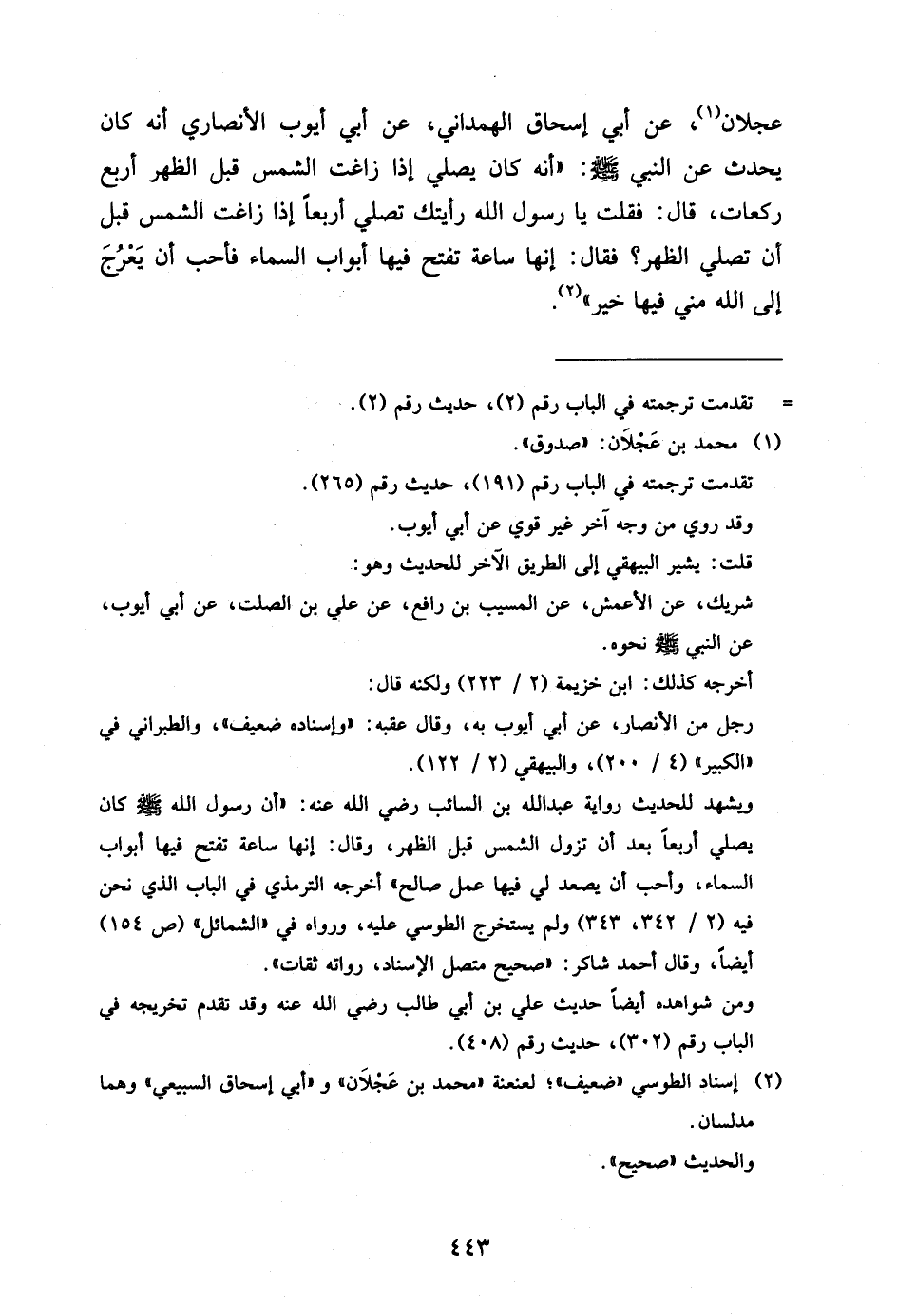 عَجْلانَ عَنْ أَبِي إِسْحَاقَ الْهَمْدَانِيِّ عَنْ أَبِي أَيُّوبَ الأَنْصَارِيِّ أَنَّهُ كَانَ يُحَدِّثُ عَنِ النَّبِيِّ صَلَّى اللَّهُ عَلَيْهِ وَسَلَّمَ أَنَّهُ كَانَ يُصَلِّي إِذَا زَاغَتِ الشَّمْسُ قَبْلَ الظُّهْرِ أَرْبَعَ رَكَعَاتٍ قَالَ فَقُلْتُ يَا رَسُولَ اللَّهِ رَأَيْتُكَ تُصَلِّي أَرْبَعًا إِذَا زَاغَتِ الشَّمْسُ قَبْلَ أَنْ تُصَلِّيَ الظُّهْرَ فَقَالَ إِنَّهَا سَاعَةٌ تُفْتَحُ فِيهَا أَبْوَابُ السَّمَاءِ فَأُحِبُّ أَنْ يَعْرُجَ إِلَى اللَّهِ مِنِّي فِيهَا خير