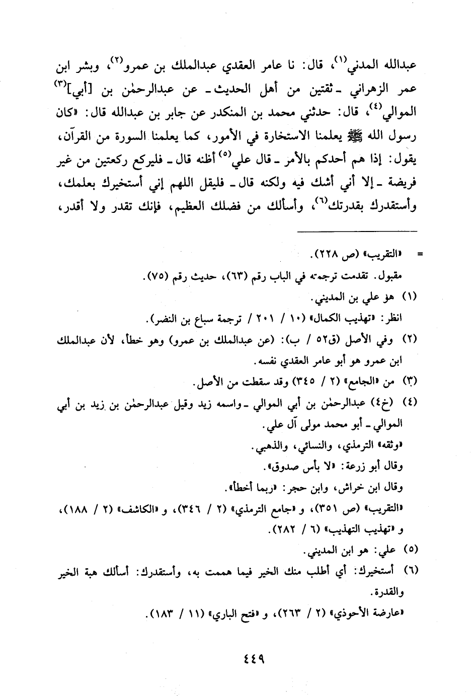 عَبْدِ اللَّهِ الْمَدَنِيُّ قَالَ نَا عَامِرٌ الْعَقَدِيُّ عبد الْملك بن عَمْرو وَبشر ابْن عُمَرَ الزَّهْرَانِيُّ ثِقَتَيْنِ مِنْ أَهْلِ الْحَدِيثِ عَنْ عَبْدِ الرَّحْمَنِ بْنِ أَبِي الْمَوَالِي قَالَ حَدَّثَنِي مُحَمَّدُ بْنُ الْمُنْكَدِرِ عَنْ جَابِرِ بْنِ عَبْدِ اللَّهِ قَالَ كَانَ رَسُولُ اللَّهِ صَلَّى اللَّهُ عَلَيْهِ وَسَلَّمَ يُعَلِّمُنَا الاسْتِخَارَةَ فِي الأُمُورِ كَمَا يُعَلِّمُنَا السُّورَةَ مِنَ الْقُرْآنِ يَقُولُ إِذَا هَمَّ أَحَدُكُمْ بِالأَمْرِ قَالَ عَلِيٌّ أَظُنُّهُ قَالَ فَلْيَرْكَعْ رَكْعَتَيْنِ مِنْ غَيْرِ فَرِيضَةٍ إِلا أَنِّي أَشُكُّ فِيهِ وَلَكِنَّهُ قَالَ فَلْيَقُلِ اللَّهُمَّ إِنِّي أَسْتَخِيرُكَ بِعِلْمِكَ وَأَسْتَقْدِرُكَ بِقُدْرَتِكَ وَأَسْأَلُكَ مِنْ فَضْلِكَ الْعَظِيمِ فَإِنَّكَ تَقْدِرُ وَلا أَقْدِرُ