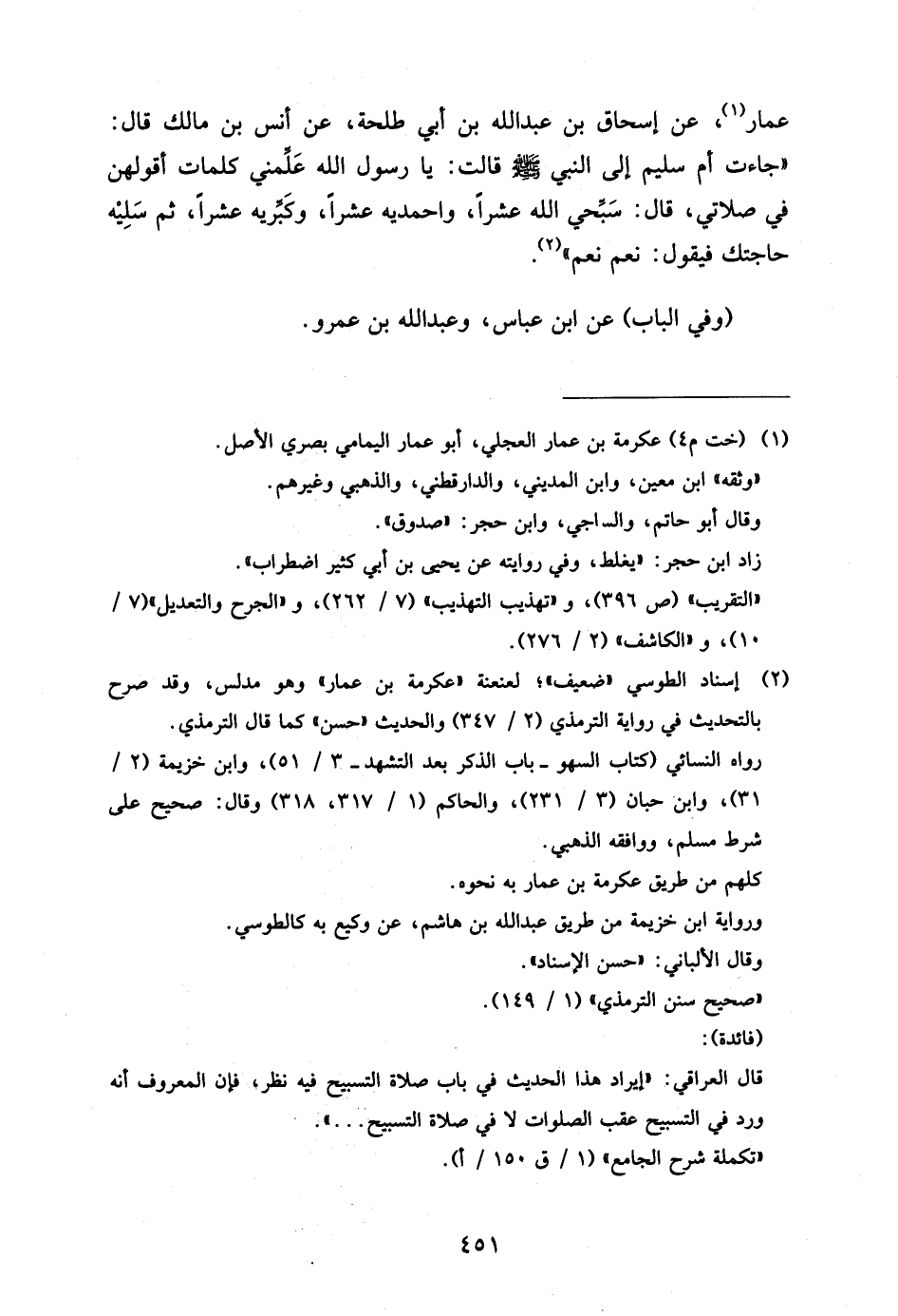 عَمَّارٍ عَنْ إِسْحَاقَ بْنِ عَبْدِ اللَّهِ بْنِ أَبِي طَلْحَةَ عَنْ أَنَسِ بْنِ مَالِكٍ قَالَ جَاءَتْ أُمُّ سُلَيْمٍ إِلَى النَّبِيِّ صَلَّى اللَّهُ عَلَيْهِ وَسَلَّمَ قَالَتْ يَا رَسُولَ اللَّهِ عَلِّمْنِي كَلِمَاتٍ أَقُولُهُنَّ فِي صَلاتِي قَالَ سَبِّحِي اللَّهَ عَشْرًا وَاحْمَدِيهِ عَشْرًا وَكَبِّرِيهِ عَشْرًا ثُمَّ سَلِيهِ حَاجَتَكِ فَيَقُولُ نَعَمْ نَعَمْ