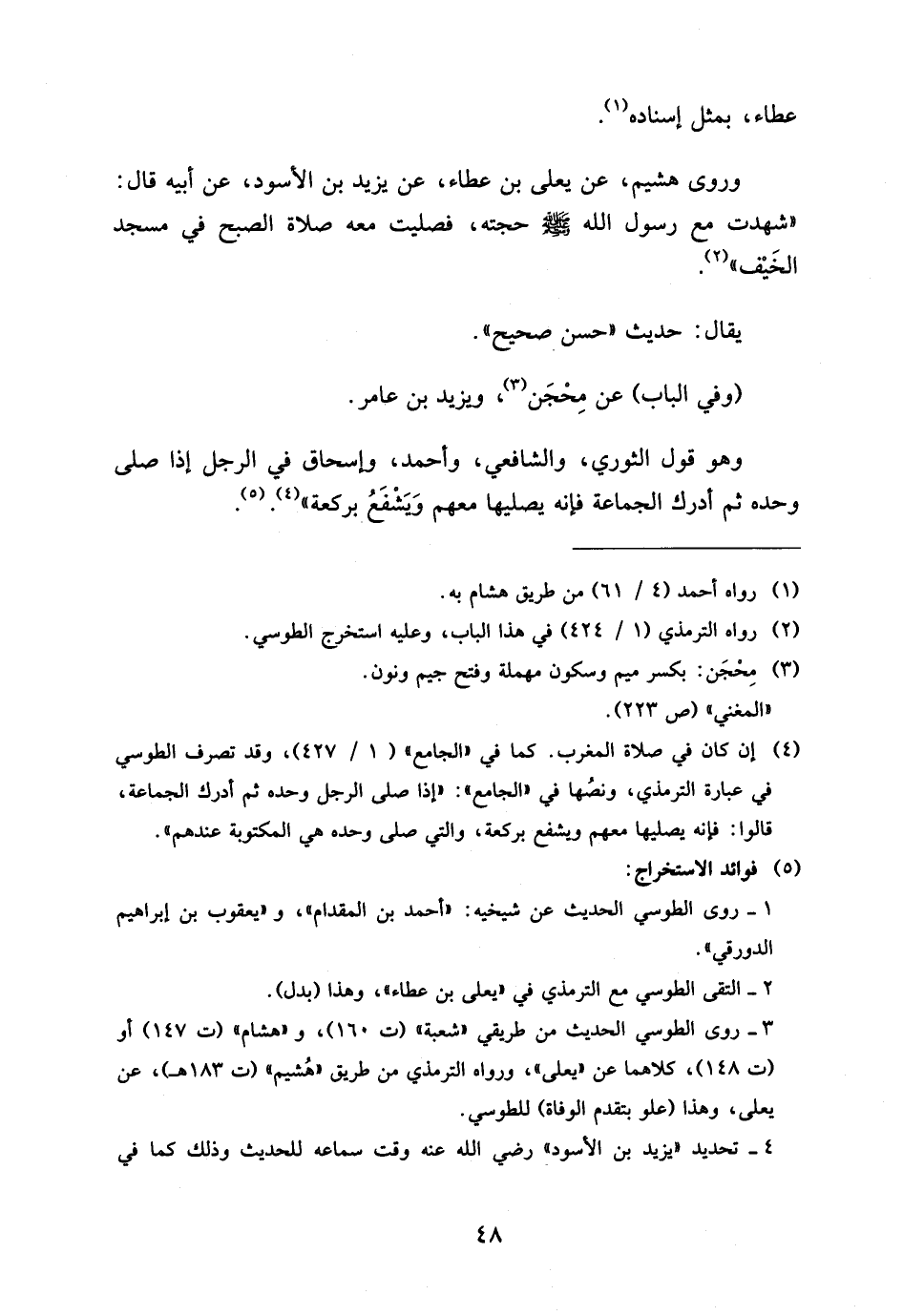 وَرَوَى هُشَيْمٌ عَنْ يَعْلَى بْنِ عَطَاءٍ عَنْ يَزِيدَ بْنِ الأَسْوَدِ عَنْ أَبِيهِ قَالَ شَهِدْتُ مَعَ رَسُولِ اللَّهِ صَلَّى اللَّهُ عَلَيْهِ وَسَلَّمَ حَجَّتَهُ فَصَلَّيْتُ مَعَهُ صَلاةَ الصُّبْحِ فِي مَسْجِدِ الْخَيْفِ