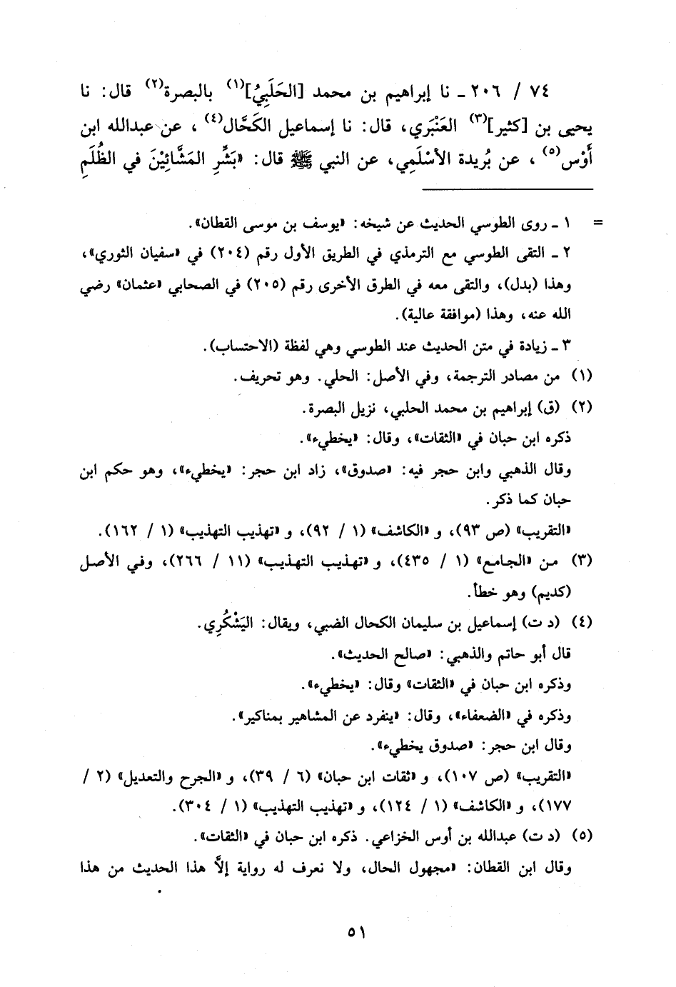 74 - / 206 نَا إِبْرَاهِيمُ بْنُ مُحَمَّدٍ الْحَلَبِيُّ بِالْبَصْرَةِ قَالَ نَا يَحْيَى بْنُ كَثِيرٍ الْعَنْبَرِيُّ قَالَ نَا إِسْمَاعِيل الكحال عَن عبد الله ابْن أَوْسٍ عَنْ بُرَيْدَةَ الأَسْلَمِيِّ عَنِ النَّبِيِّ صَلَّى اللَّهُ عَلَيْهِ وَسَلَّمَ قَالَ بَشِّرِ الْمَشَّائِينَ فِي الظُّلم