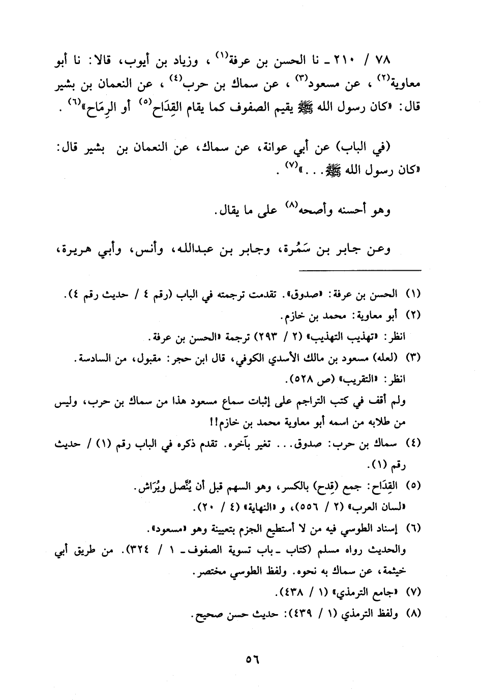 78 - / 210 نَا الْحَسَنُ بْنُ عَرَفَةَ وَزِيَادُ بْنُ أَيُّوبَ قَالا نَا أَبُو مُعَاوِيَةَ عَنْ مَسْعُودٍ عَنْ سِمَاكِ بْنِ حَرْبٍ عَنِ النُّعْمَانِ بْنِ بَشِيرٍ قَالَ كَانَ رَسُولُ اللَّهِ صَلَّى اللَّهُ عَلَيْهِ وَسَلَّمَ يُقِيمُ الصُّفُوفَ كَمَا يُقَامُ الْقِدَاحُ أَوِ الرِّمَاحِ