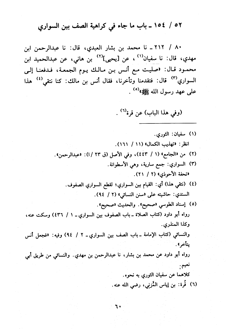 52 - / 154 بَابُ مَا جَاءَ فِي كَرَاهِيَةِ الصَّفِّ بَيْنَ السَّوَارِي