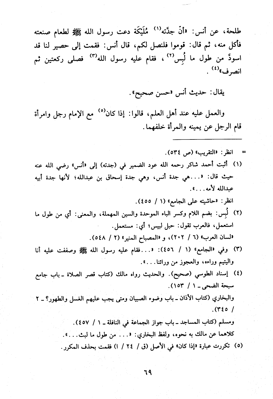 طَلْحَةَ عَنْ أَنَسٍ أَنَّ جَدَّتَهُ مُلَيْكَةَ دَعَتْ رَسُولَ اللَّهِ صَلَّى اللَّهُ عَلَيْهِ وَسَلَّمَ لِطَعَامٍ صَنَعَتْهُ فَأَكَلَ مِنْهُ ثُمَّ قَالَ قُومُوا فَلْنُصَلِّ لَكُمْ قَالَ أَنَسٌ فَقُمْتُ إِلَى حَصِيرٍ لَنَا قَدِ اسْوَدَّ مِنْ طُولِ مَا لُبِسَ فَقَامَ عَلَيْهِ رَسُولُ اللَّهِ فَصَلَّى رَكْعَتَيْنِ ثُمَّ انْصَرَفَ