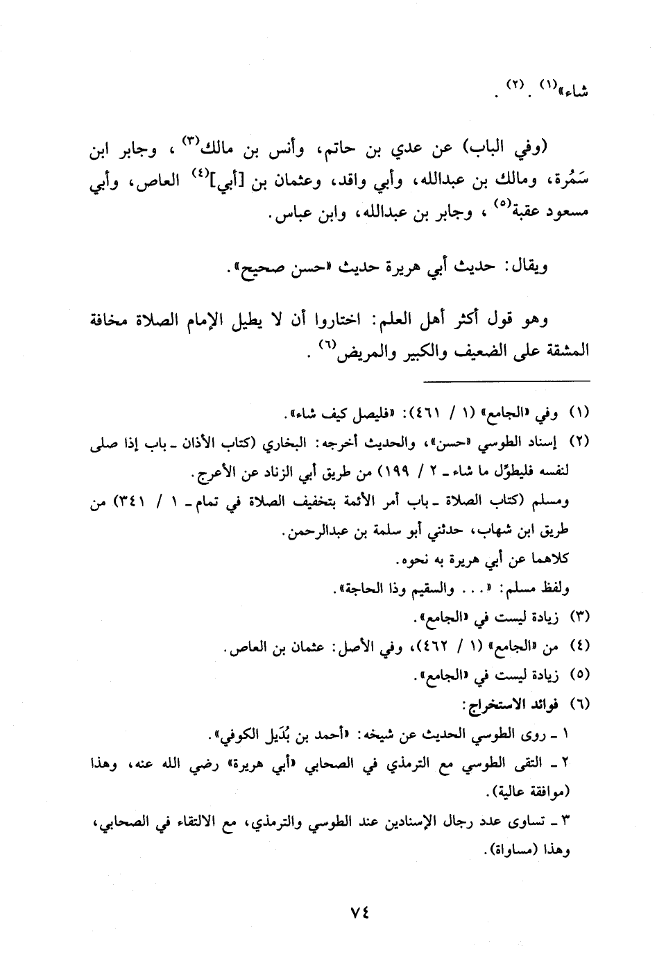 وَهُوَ قَوْلُ أَكْثَرِ أَهْلِ الْعِلْمِ اخْتَارُوا أَنْ لَا يُطِيلَ الإِمَامُ الصَّلاةَ مَخَافَةَ الْمَشَقَّةِ عَلَى الضَّعِيفِ وَالْكَبِير وَالْمَرِيض