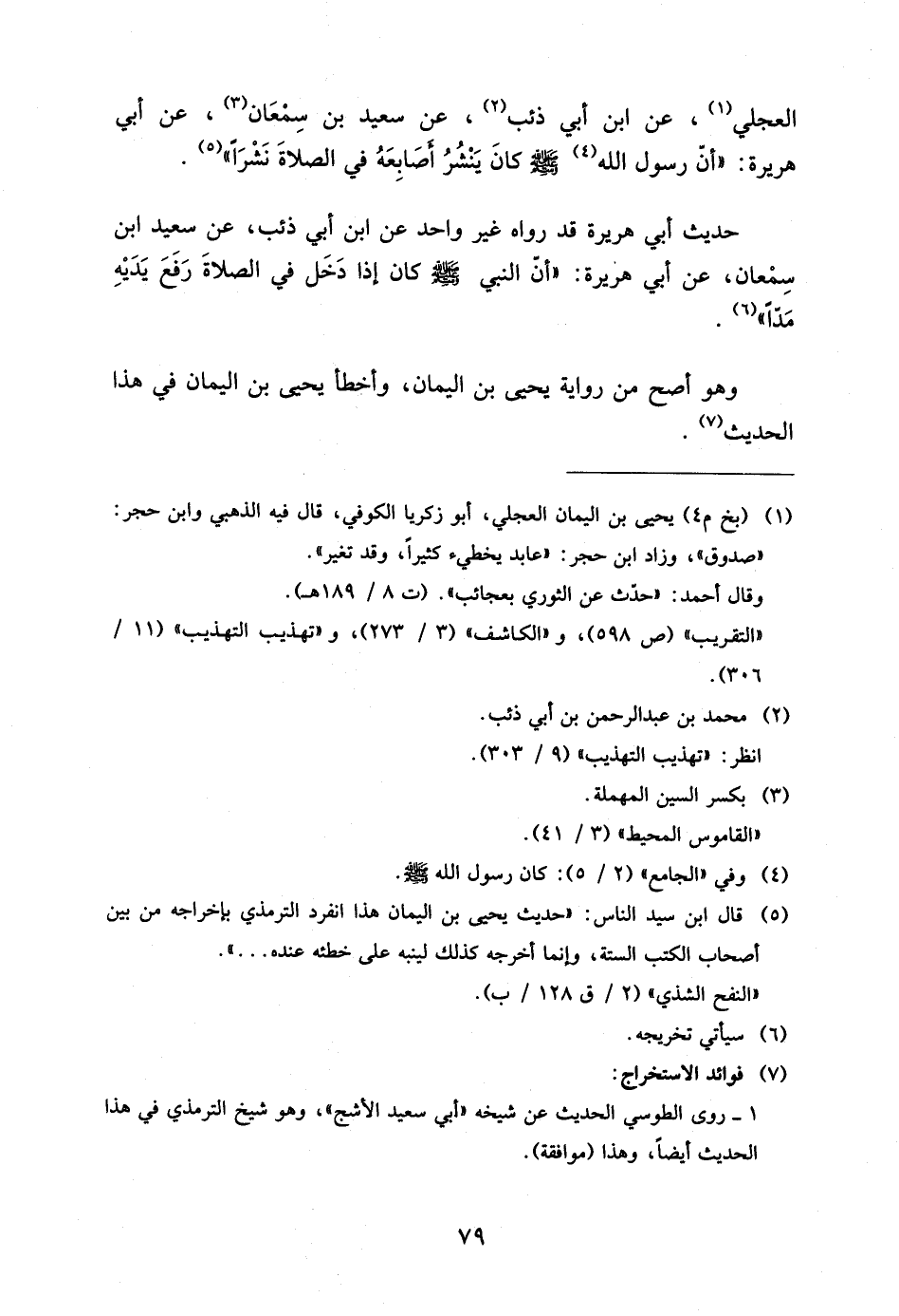 الْعِجْلِيُّ عَنِ ابْنِ أَبِي ذِئْبٍ عَنْ سَعِيدِ بْنِ سَمْعَانَ عَنْ أَبِي هُرَيْرَةَ أَنَّ رَسُولَ اللَّهِ صَلَّى اللَّهُ عَلَيْهِ وَسَلَّمَ كَانَ يَنْشُرُ أَصَابِعَهُ فِي الصَّلاةِ نَشْرًا
