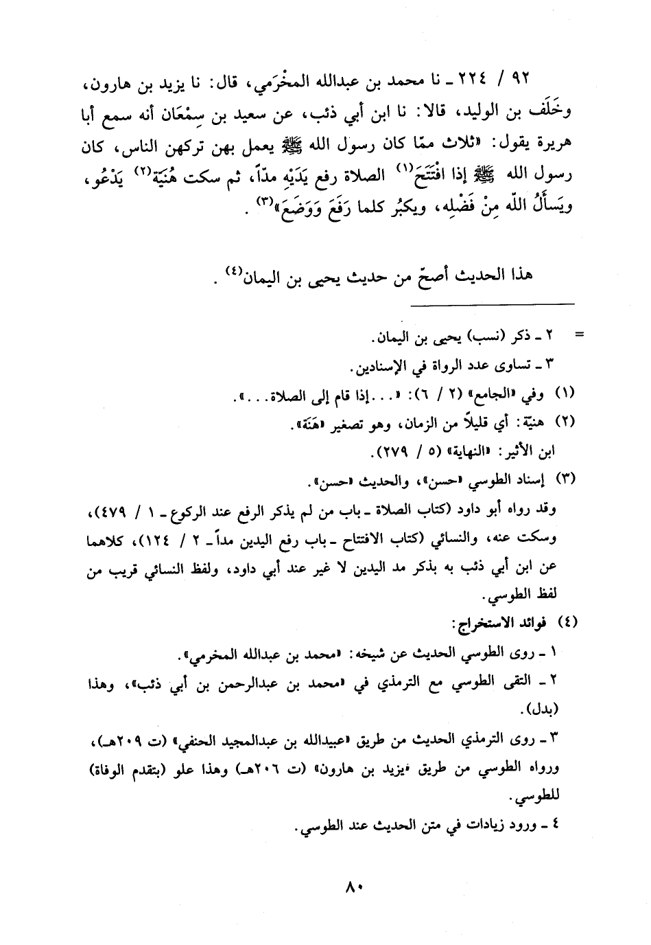 92 - / 224 نَا مُحَمَّدُ بْنُ عَبْدِ اللَّهِ الْمخرمِيُّ قَالَ نَا يَزِيدُ بْنُ هَارُونَ وَخَلَفُ بْنُ الْوَلِيدِ قَالا نَا ابْنُ أَبِي ذِئْبٍ عَنْ سَعِيدِ بْنِ سَمْعَانَ أَنَّهُ سَمِعَ أَبَا هُرَيْرَةَ يَقُولُ ثَلاثٌ مِمَّا كَانَ رَسُولُ اللَّهِ صَلَّى اللَّهُ عَلَيْهِ وَسَلَّمَ يَعْمَلُ بِهِنَّ تَرَكَهُنَّ النَّاسُ كَانَ رَسُولَ اللَّهِ صَلَّى اللَّهُ عَلَيْهِ وَسَلَّمَ إِذَا افْتَتَحَ الصَّلاةَ رَفَعَ يَدَيْهِ مَدًّا ثُمَّ سَكَتَ هُنَيَّةً يَدْعُو وَيَسْأَلُ اللَّهَ مِنْ فَضْلِهِ وَيُكَبِّرُ كُلَّمَا رَفَعَ وَوَضَعَ