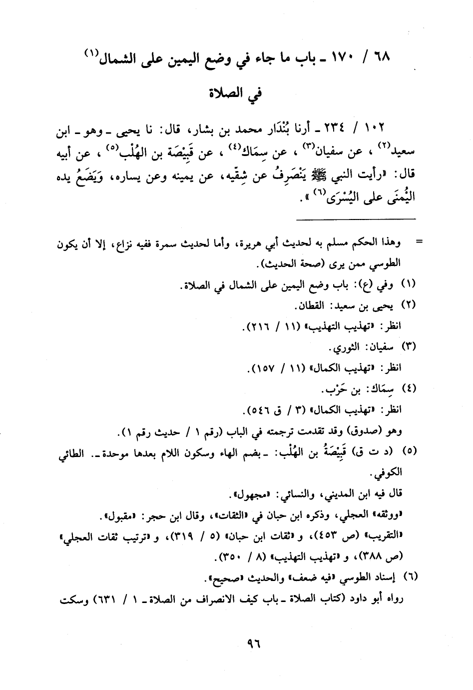 68 - / 170 بَابُ مَا جَاءَ فِي وَضْعِ الْيَمِينِ عَلَى الشمَال فِي الصَّلَاة