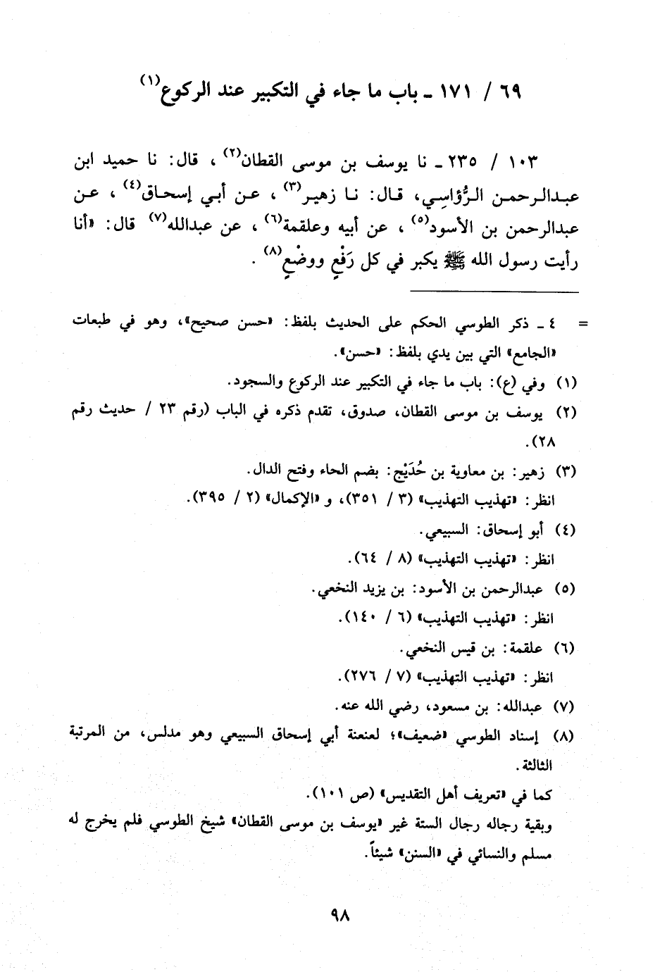 103 - / 235 نَا يُوسُفُ بْنُ مُوسَى الْقَطَّانُ قَالَ نَا حميد ابْن عَبْدِ الرَّحْمَنِ الرُّؤَاسِيُّ قَالَ نَا زُهَيْرٌ عَنْ أَبِي إِسْحَاقَ عَنْ عَبْدِ الرَّحْمَنِ بْنِ الأَسْوَدِ عَنْ أَبِيهِ وَعَلْقَمَةَ عَنْ عَبْدِ اللَّهِ قَالَ أَنَا رَأَيْتُ رَسُولَ اللَّهِ صَلَّى اللَّهُ عَلَيْهِ وَسَلَّمَ يُكَبِّرُ فِي كُلِّ رَفْعٍ وَوَضْعٍ