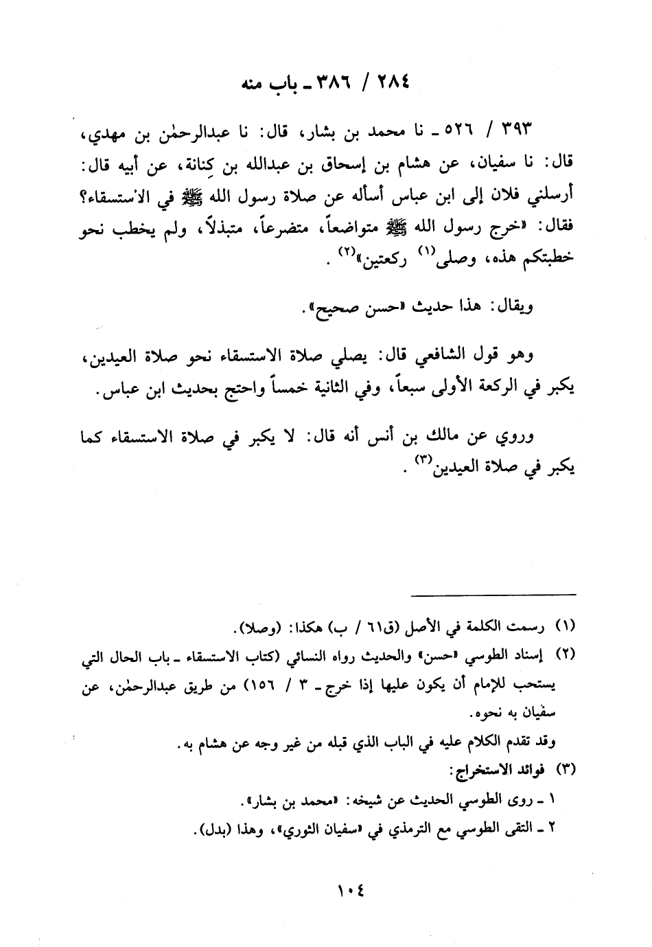 393 - / 526 نَا مُحَمَّدُ بْنُ بَشَّارٍ قَالَ نَا عَبْدُ الرَّحْمَنِ بْنُ مَهْدِيٍّ قَالَ نَا سُفْيَانَ عَنْ هِشَامِ بْنِ إِسْحَاقَ بْنِ عَبْدِ اللَّهِ بْنِ كِنَانَةَ عَنْ أَبِيهِ قَالَ أَرْسَلَنِي فُلانٌ إِلَى ابْنِ عَبَّاسٍ أَسْأَلُهُ عَنْ صَلاةِ رَسُولُ اللَّهِ صَلَّى اللَّهُ عَلَيْهِ وَسَلَّمَ فِي الاسْتِسْقَاءِ فَقَالَ خَرَجَ رَسُولُ اللَّهِ صَلَّى اللَّهُ عَلَيْهِ وَسَلَّمَ مُتَوَاضِعًا مُتَضَرِّعًا مُتَبَذِّلًا وَلَمْ يَخْطُبْ نَحْوَ خُطْبَتِكُمْ هَذِهِ وَصَلَّى رَكْعَتَيْنِ